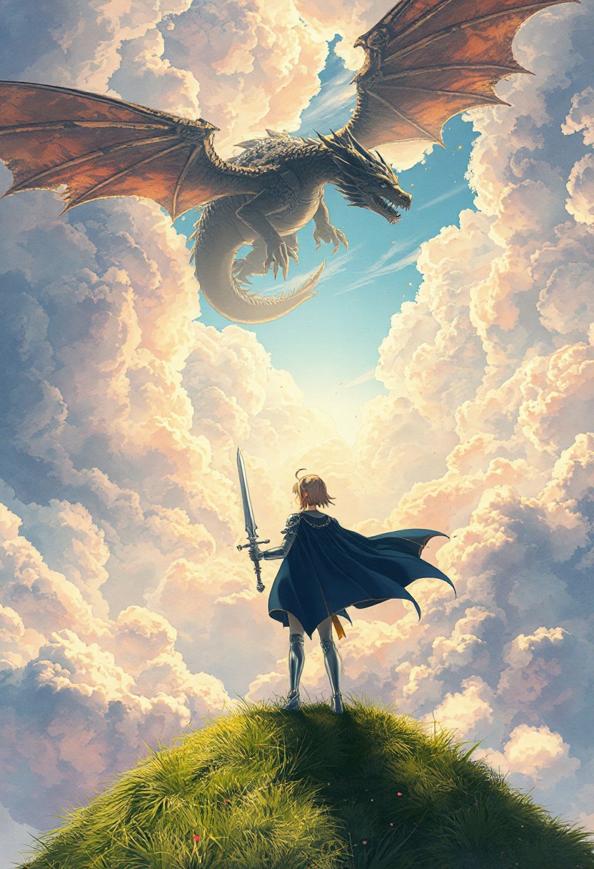 "Vertical 9:16 anime-style sky in ultra-detailed 4K resolution. A vast, painterly sky stretches endlessly, filled with massive, textured clouds in complex folds, soft ridges, and jagged contours. Gaps reveal glowing baby-blue sky and warm sunlight streaming through. Below, Saber from Fate/stay night stands firm atop a grassy cliff, her silver armor gleaming, Excalibur drawn and glowing faintly in her hand. Her flowing blue cape catches the wind as she locks eyes with a colossal dragon hovering in the clouds above. The dragon’s scales shimmer with obsidian and gold tones, its wings vast and torn by age. The scene is richly cinematic: dreamy pastel tones shift into high-contrast lighting, with deep cel shading, soft bloom, ambient haze, and hyper-detailed watercolor texture. A moment of mythical confrontation frozen in time — heroic, emotional, and alive with magical tension.