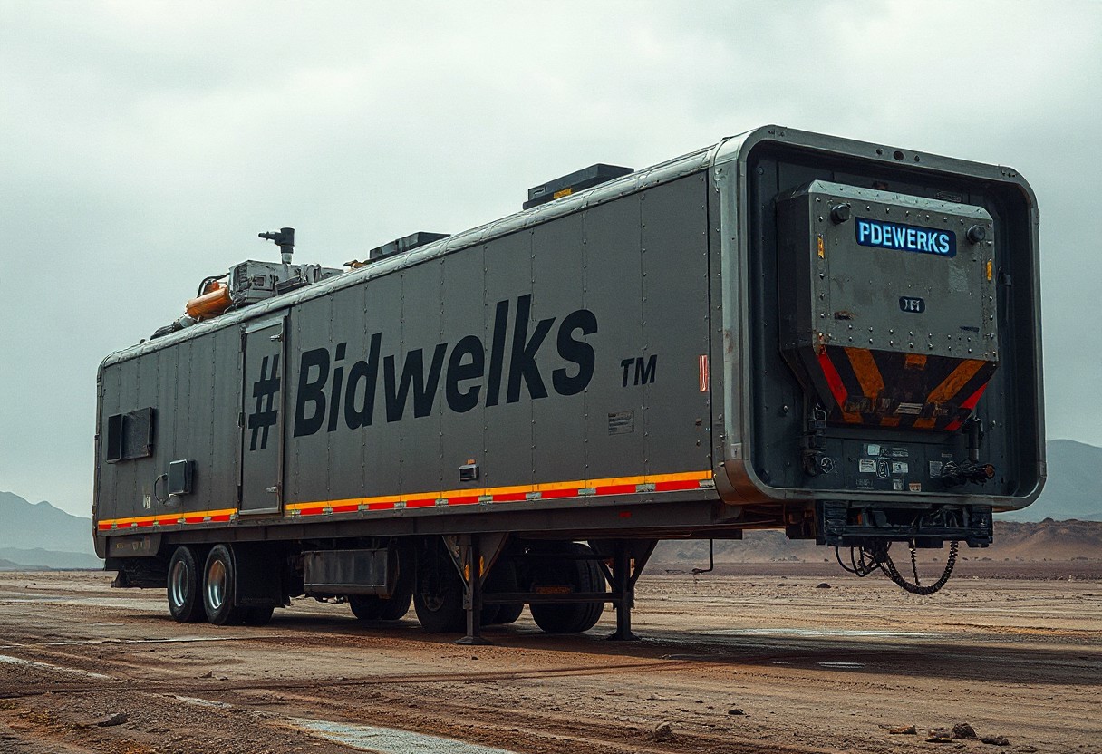 1 vehicle, cyberpunk oversize industrial trailer. Logo label "BDwerks®" written on the side nothing else written.