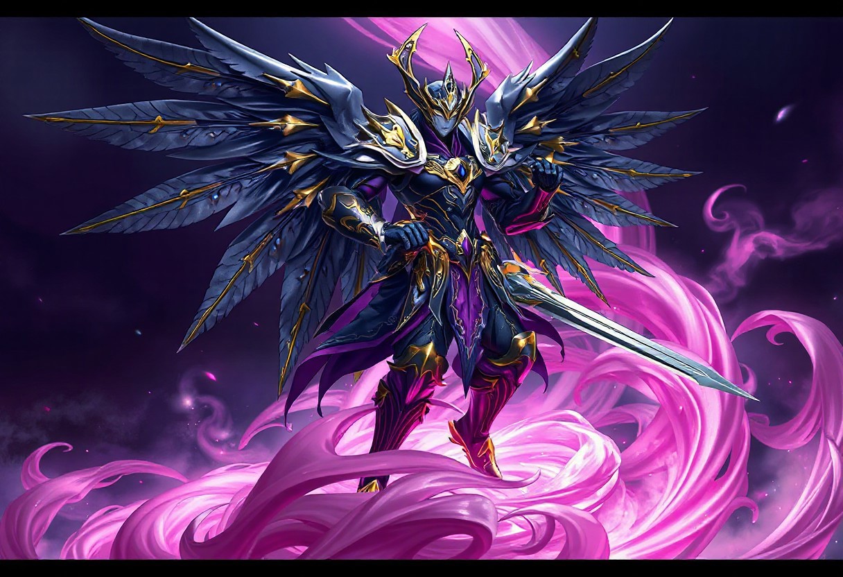 "This artwork showcases a dynamic and powerful Gearfried the Swordmaster, adorned in intricate black, purple, and gold armor with striking wings. They stand in a ready stance on a pink swirl, with a Clockwork Night background emphasizing the Gearfried the Swordmaster's central role. The artwork is expertly composed with vivid colors, sharp details, and a 8k resolution, evoking a sense of epic grandeur with its lifelike details, creative angle, and captivating lighting."