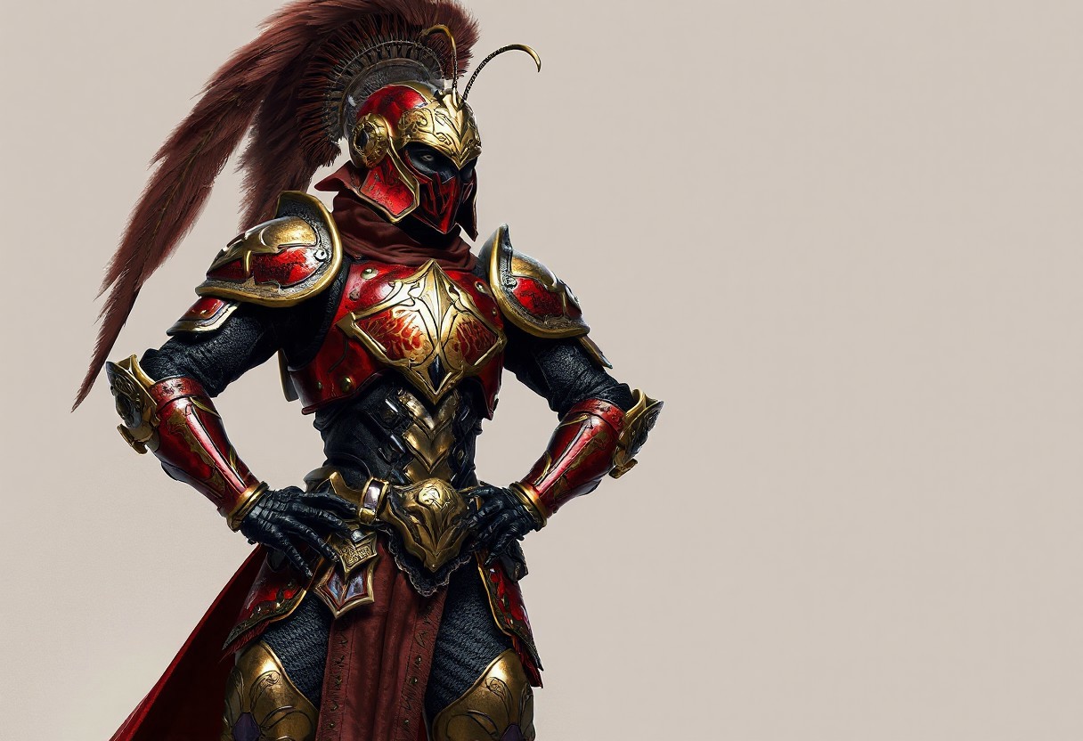 Digital rendering showcases a Gravekeeper's Cannonholder, ready for battle, dressed in an intricately detailed Metal Armored Bug suit, predominantly red and gold with black and silver accents. The helmet features a prominent plume, and the Cannonholder's confident posture, with one hand on the hip and the other on the thigh, exudes a sense of readiness. A neutral backdrop of an Aquamirror Contact enhances the vibrant colors of the armor in the 4K image, which boasts exceptional quality, lifelike details, sharp lines, harmonious colors, and a dynamic action pose, all handcrafted with precision and high-quality brush strokes. The image's impeccable composition, captivating lighting, and vivid emotions make it a stunning and beautiful artwork, with detailed eyes and a powerful message, trending on ArtstationHQ.