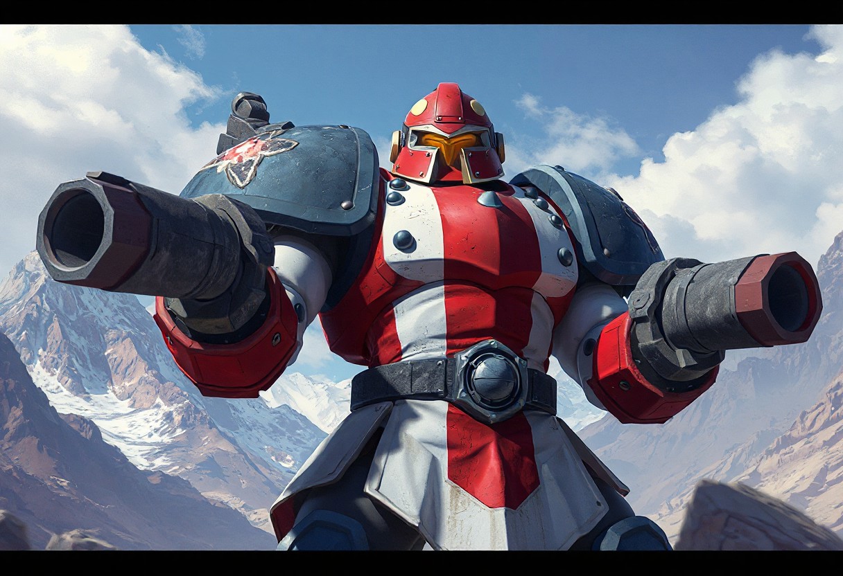 "Illustrate a Golem Sentry in a vibrant color scheme of red, white, and blue, equipped with stone guns, against a mountainous landscape backdrop. The image should emphasize exceptional quality, lifelike details, sharp lines, stunning colors, and impeccable composition. The Golem Sentry's head should have a yellow visor for contrast. Achieve a captivating and well-timed moment with octane render, unreal engine 5, and a dynamic action pose. Trend on ArtstationHQ with this 4K, highly detailed, cinematic lighting, volumetric, and hyperrealistic illustration."