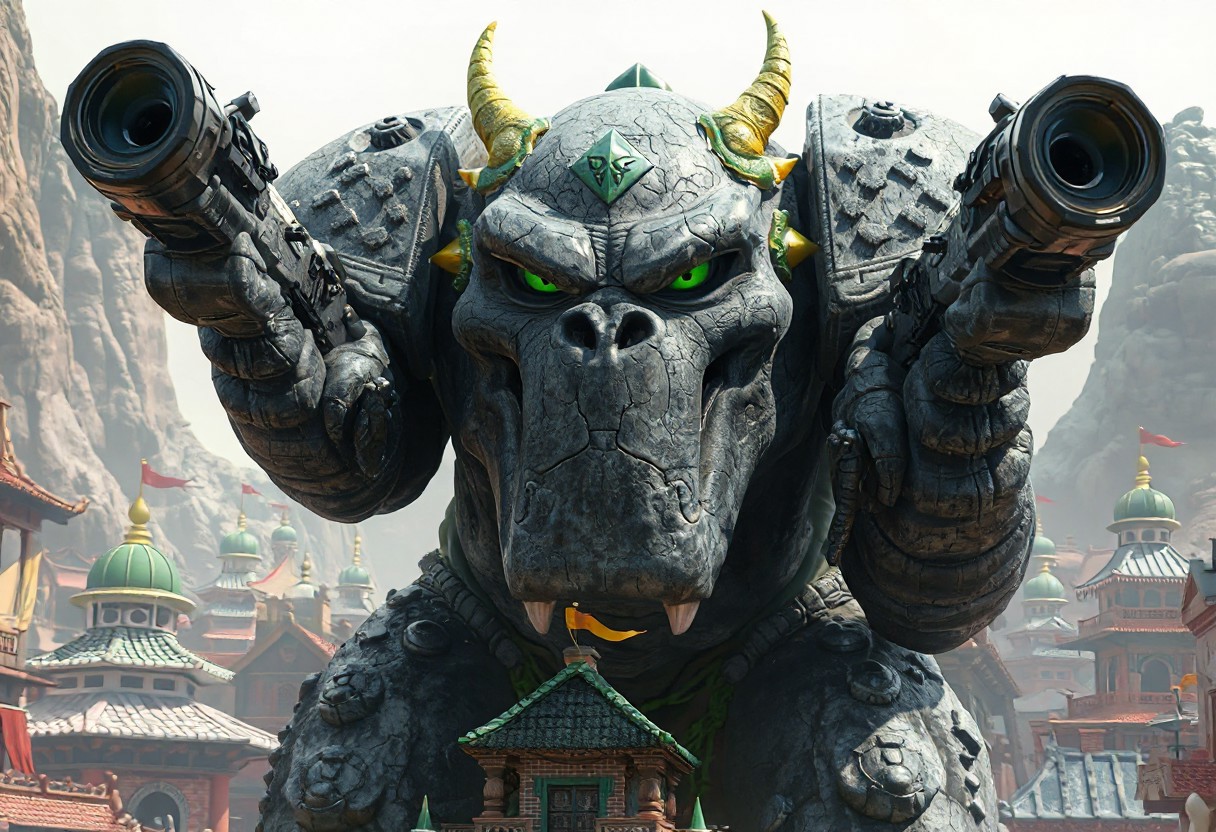 "Immerse yourself in the epic scene of a colossal Gorgonic Golem standing guard in an ancient city. This 4K, hyper-realistic artwork showcases the Golem's detailed face, adorned with green and yellow accents, and equipped with two guns. The city's buildings, including a green one with a white roof, contrast the gray surface, enhancing the playful setting. The Golem's dynamic action pose, vivid emotions, and captivating lighting bring this cinematic masterpiece to life, making it perfect for CGSociety or Artstation's trending page. Experience the intricate detail and photorealistic quality with dynamic lighting and coherent artwork."