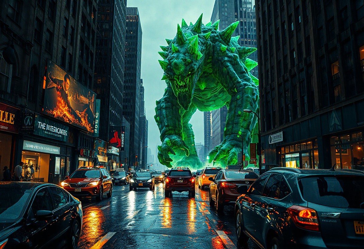 aidmaImageUpgrader, a random photo, on the streets of new york, traffic jam, burning buildings, green flames, giant ulty detailed monster made of jade crystals in the background, at night, raining, ultra realistic looking,