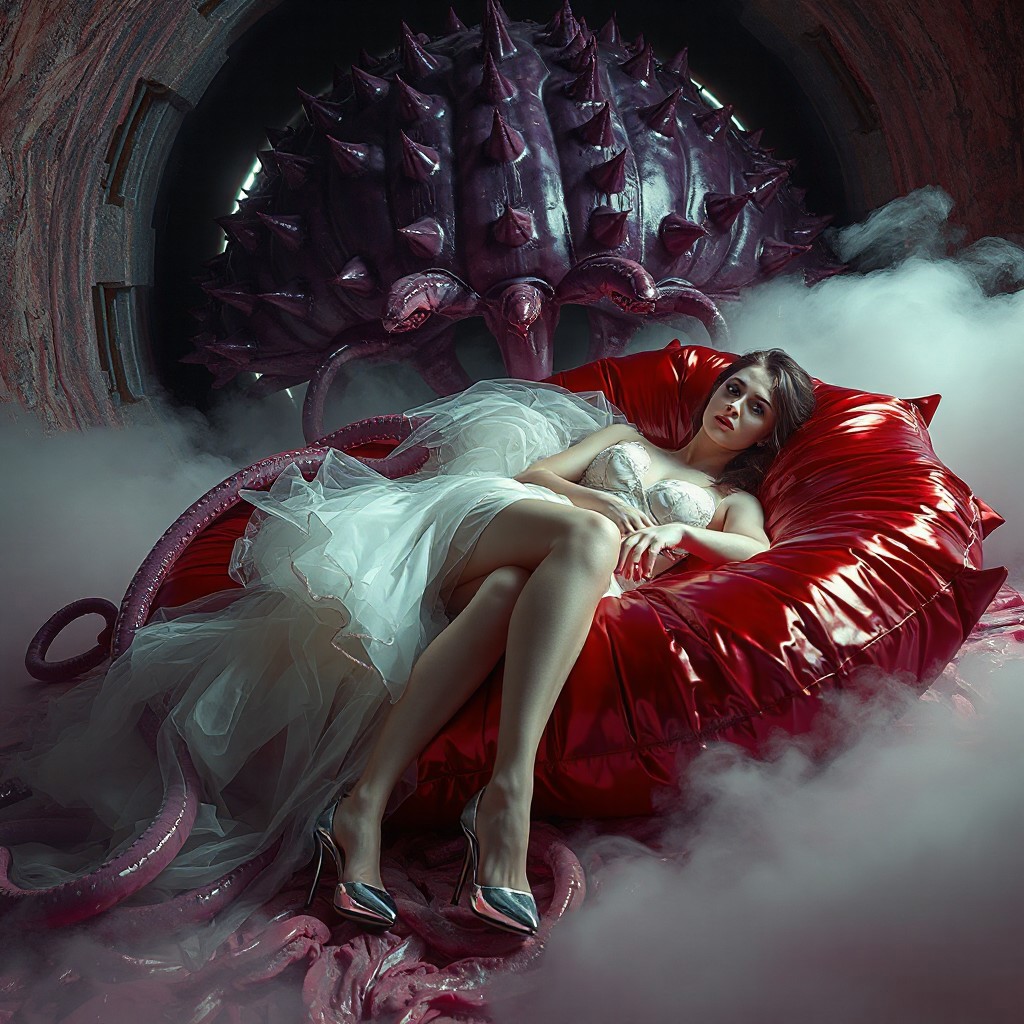 young russian bride in ivory honeymoon lingerie and glossy high heels, entangled in long tentacles, laying reclined in weird red foil pillows, covered with giant ultrathin transparent slime veils, giant portal to outer space, fog from the floor, giant purple alien carnivorous flower with glossy spiked petals at background, weird alien hive slime walls and fleshy floor, horror, reminiscent of H.R. Giger, Zdzisław Beksinski, and Ash Thorp's dark, sleek styles, with close-up glamour photography, glossy satin and silver heels glistening, fleshy slime dripping, and dark shadows.