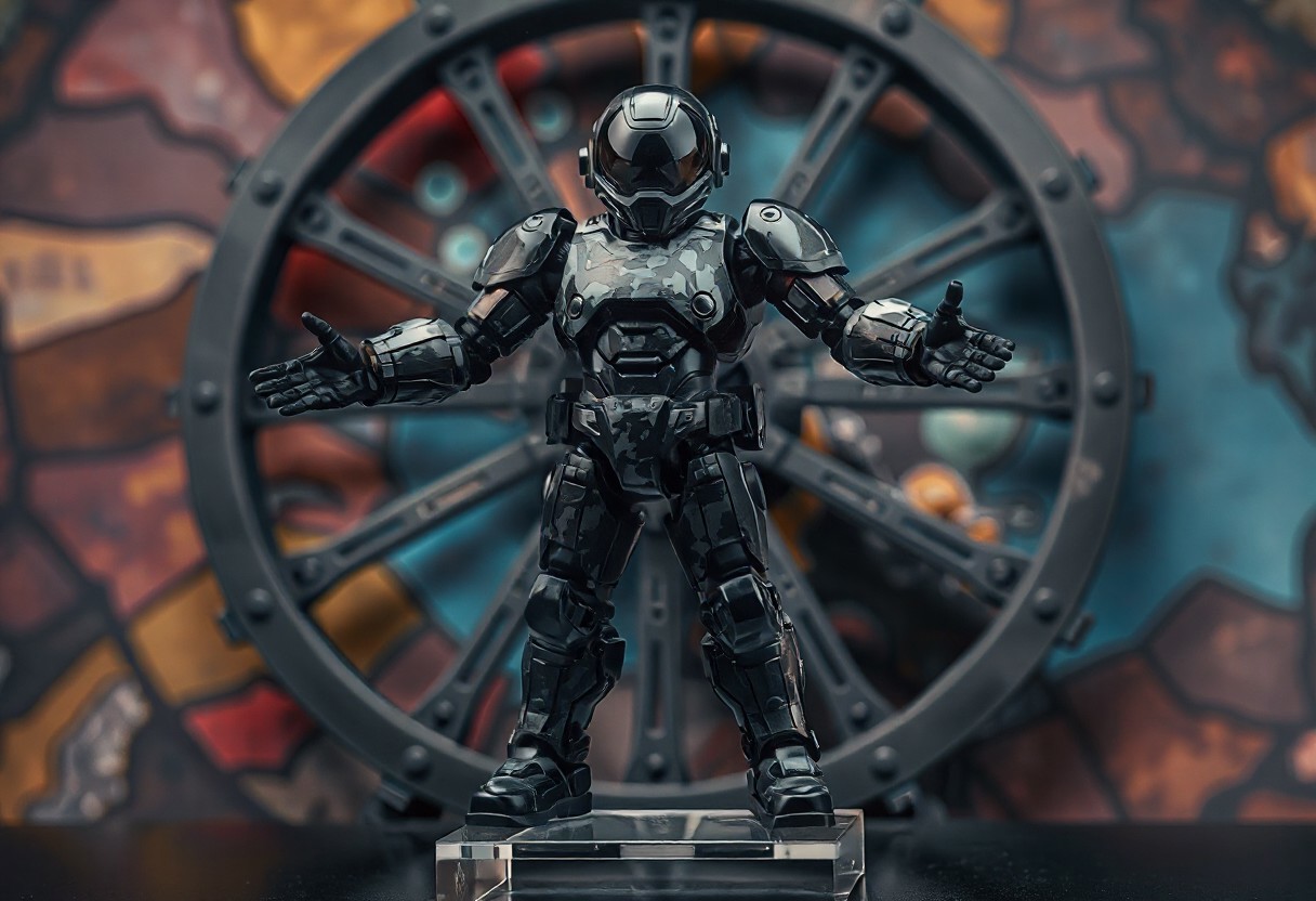The image features a highly detailed, full-body view of a Neo Bubbleman, exuding an aura of advanced technology and precision, predominantly black and gray, stands boldly on a clear stand, arms outstretched in a ready stance. A camouflage pattern adorns the Neo Bubbleman's body, adding a sense of realism. Placed in front of a Cannon Wheel, the dark color scheme creates a striking contrast. A vibrant, detailed background enhances the composition.