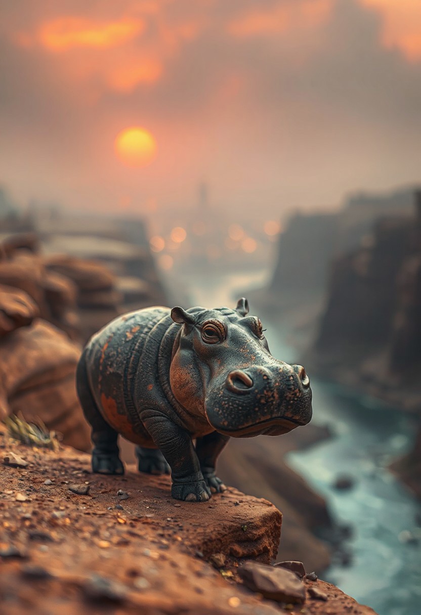 professional photography, perfect timing, perfect quality, 16k, very detailed, highly detailed, realistic, photorealistic, scinematic, Volumetric lighting, depth of field, wide angle, cinematic, vibrant, dynamic lighting, dramatic light. Atmospheric effects, bokeh, low lighting, dark shadows, strong shadows, dramatic lighting, highly detailed, detailed miniature shot of a rusty miniature happy hippo walking at a vast detailed sandrock canyon on the side of tiny river, around him tiny paper dark warm theme, foggy, dim red dawn, soft clouds glowing because of the city in the far distance,