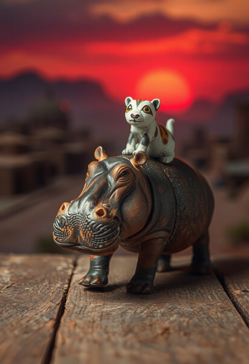professional photography, perfect timing, perfect quality, 16k, very detailed, highly detailed, realistic, photorealistic, scinematic, Volumetric lighting, depth of field, wide angle, cinematic, vibrant, dynamic lighting, dramatic light. Atmospheric effects, bokeh, low lighting, dark shadows, strong shadows, dramatic lighting, highly detailed, detailed miniature shot of a rusty miniature happy hippo walking on a dusty old wooden table. in the background a vast detailed desert village. on his back a cute miniature citten made of paper painten in real color. hot evening theme, dim red dawn, soft clouds,