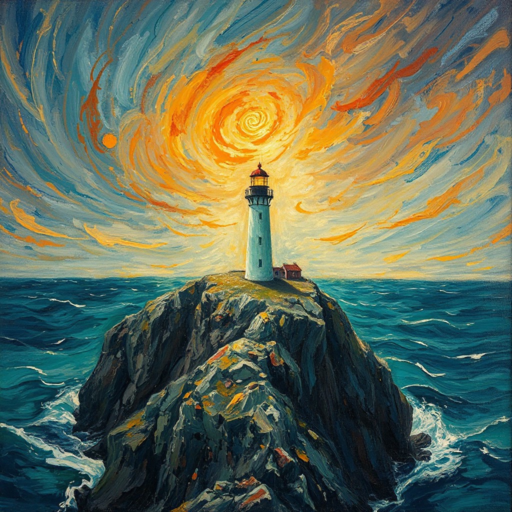 Oil painting, reminiscent of Van Gogh, depicting a solitary lighthouse perched atop a craggy, windswept cliff overlooking a turbulent turquoise sea. The sky is a swirling canvas of deep indigo and fiery orange, punctuated by streaks of golden sunlight breaking through the clouds. Thick, impasto brushstrokes capture the raw power of the ocean and the lighthouseâs steadfast resilience. A melancholic yet hopeful atmosphere pervades, with warm light illuminating the tower, suggesting a beacon of safety amidst the storm. cinematic, film, analog film stocks, Kodak Vision3 500T, Kodak Portra 400, Kodak VISION3 250D, Kodak Gold 200, Kodak Ektar, Kodak