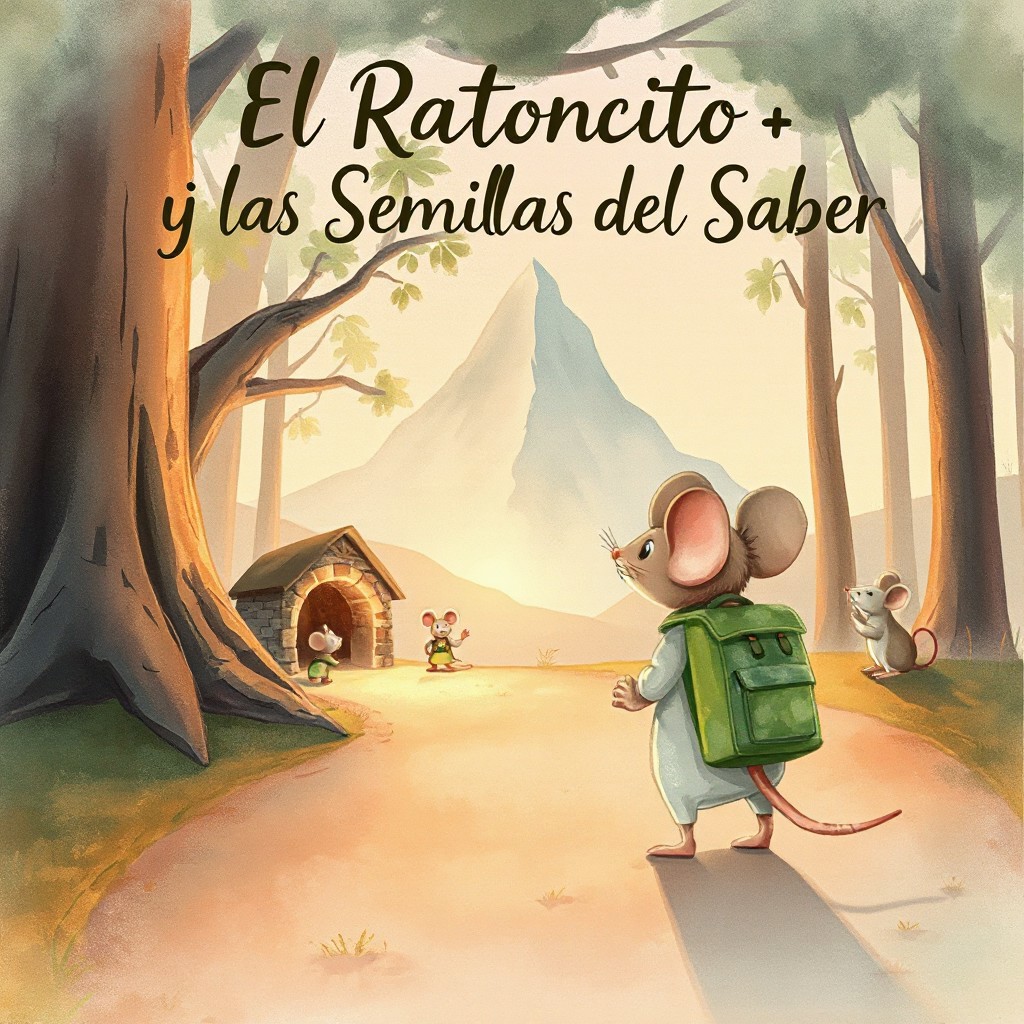 A heartwarming children's book cover illustration for a story titled El Ratoncito y las Semillas del Saber. A small, tender mouse stands on a soft forest path at sunrise, wearing a tiny green backpack. The mouse gazes up toward a tall, misty mountain in the distance, symbolizing a journey of knowledge. Behind the mouse, a warm mouse burrow is nestled under tree roots, glowing softly with golden light. A gentle mouse family — a mother, a sibling, and a small elderly mouse — waves goodbye with love and pride. The style is whimsical, storybook-like, with soft watercolor textures, pastel colors, and expressive faces. The atmosphere is emotional but hopeful, showing both the love of the family and the courage of the little mouse. The title El Ratoncito y las Semillas del Saber appears at the top in hand-drawn, friendly lettering, like a classic illustrated tale for children.
