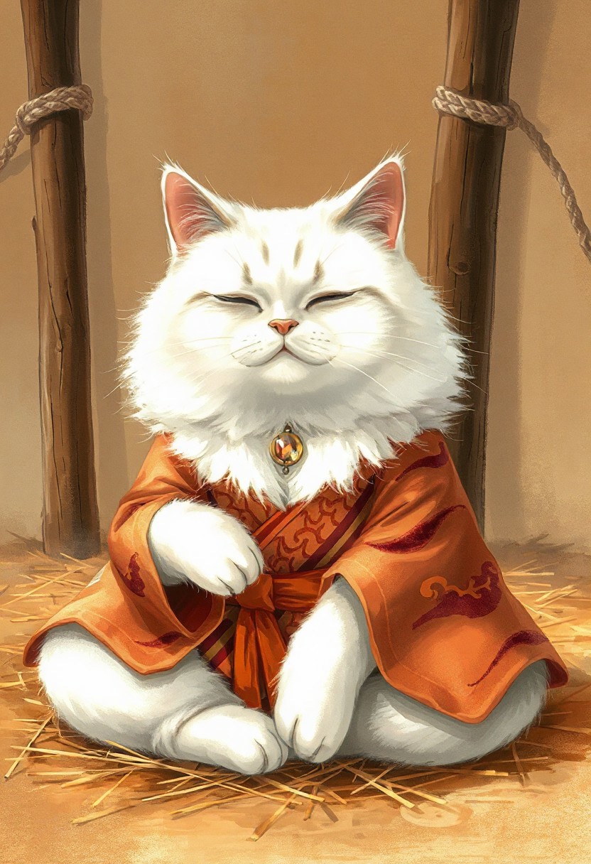 A white cat, resembling a aloha shirt, is seated in a meditative pose, reminiscent of a Zen master. The cat is wearing a traditional Japanese-style kimono, featuring orange and maroon patterns. The kimono's details include an orange obi (sash) and a decorative jewel-like stone on it. The cat's fur is fluffy and long, with a soft, delicate appearance. Its eyes are closed, giving a peaceful and serene expression. The cat's body is positioned in a relaxed, seated posture, with paws resting on its lap. It is centered in the image and facing the viewer directly. The background is a muted, earthy tone, with a depiction of hay or straw, creating a tranquil atmosphere. Wooden posts with rope are visible in the background, contributing to a rustic, serene setting. The lighting is soft and warm, highlighting the cat's features and the kimono's patterns. The overall style is artistic, with detailed brushstrokes and soft color blending. The image exudes a sense of calm and tranquility. fir needle style,