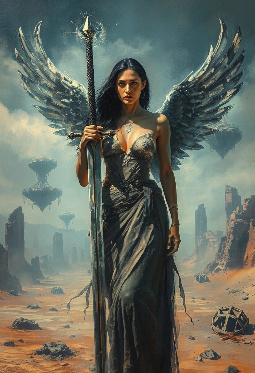 Create a surreal oil painting featuring Monica Bellucci as a Valkyrie, a Norse goddess of battle and prophecy, embodying strength and ethereal beauty. The style should combine hyperrealism with the loose, expressive brushwork of Gerhard Richter, creating a sense of ambiguity and emotional depth. The setting is a fragmented and dreamlike version of GTA 5's Blaine County, where the desert landscape is juxtaposed with floating islands and shattered remnants of skyscrapers. Bellucci is depicted in a dynamic, warrior-like pose, one hand resting on a spectral sword. Use dramatic lighting with a cool, blue tint to create a sense of otherworldly beauty and impending doom. Incorporate subtle details such as blurred edges and faint, shimmering energy fields. The image should be beautiful, disturbing, and filled with symbolic meaning, evoking a sense of ancient power and the inevitability of fate. 8k resolution, cinematic lighting, dramatic shadows, ultra-detailed.