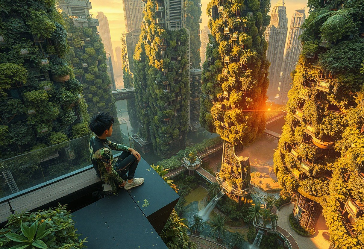 A futuristic eco-city covered in massive vertical gardens,where skyscrapers intertwine with lush greenery. A boy wearing a futuristic outfit adorned with nature-inspired patterns sits on a rooftop platform,overlooking aerial walkways and flowing water features surrounded by vegetation. The golden hues of sunset cast dynamic shadows,creating a harmonious yet mysterious atmosphere.,<lora:kcyberpunk-01:0.8>,kyberpunk,