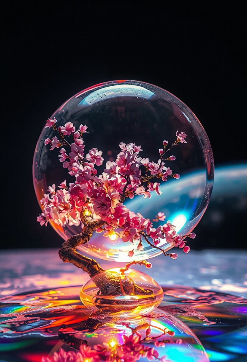 cherry blossom tree, completely transparent, reflective iridescent surface, glass art, colorful, translucent, Space, Lunar Surface, Cherry blossoms glow faintly, Earth in the background, Japanese art style, Japanese ink painting, best quality, sharp focus, high contrast, colorful, ultra quality, 8k, best quality,