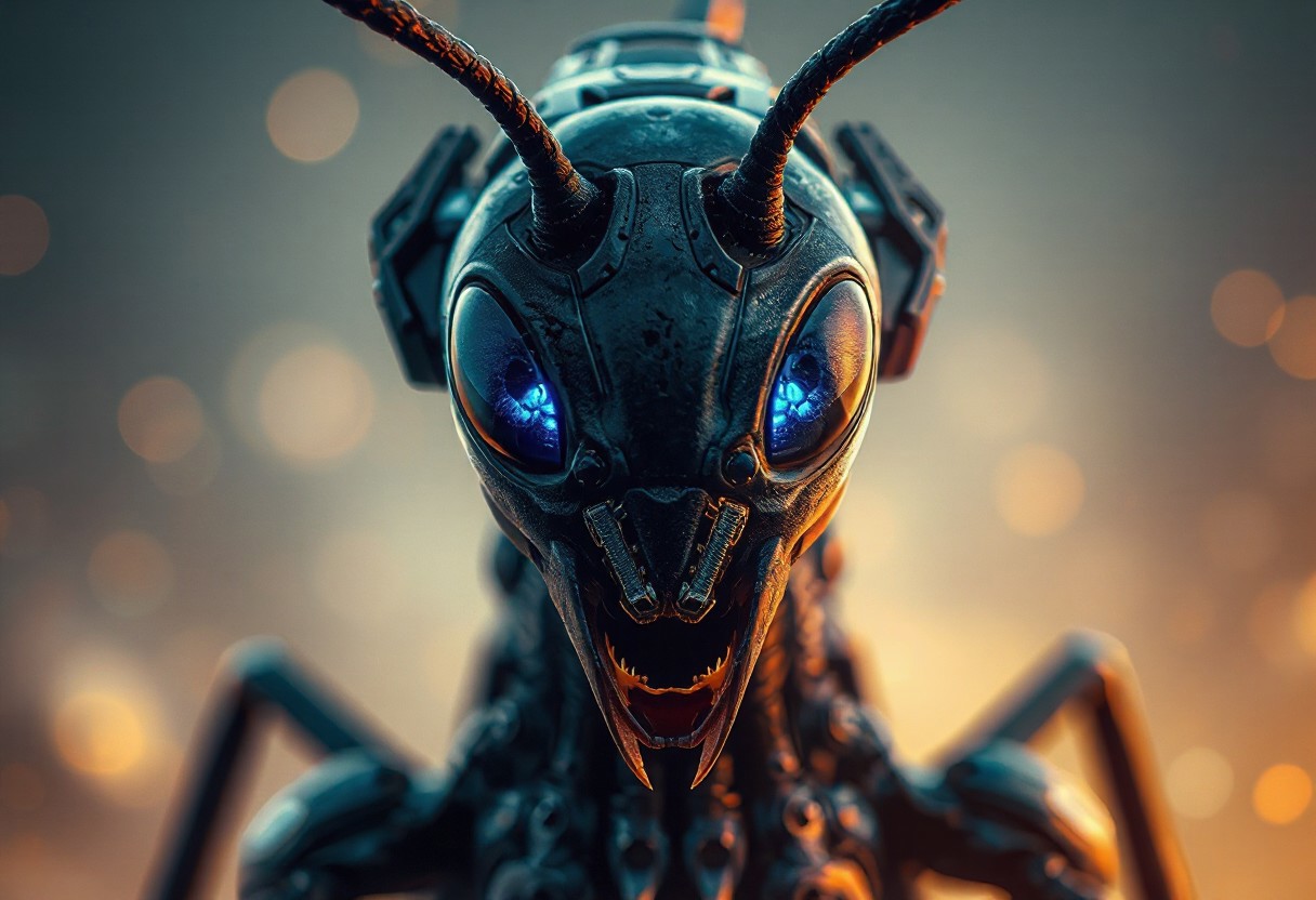 "High-res 4K depiction of a Cyber Raider with an ant's head, emphasizing vivid blue eyes and antennae. The ant's head is the central focus, with a dark blue Cyber Raider body in the foreground. The image boasts exceptional quality, lifelike details, sharp lines, harmonious colors, and a captivating matte painting. A dynamic action pose, vivid emotions, and a powerful message are showcased with the help of Octane Render and Unreal Engine 5. A trending masterpiece on Artstation and CGSociety, created in the style of Greg Rutkowski."