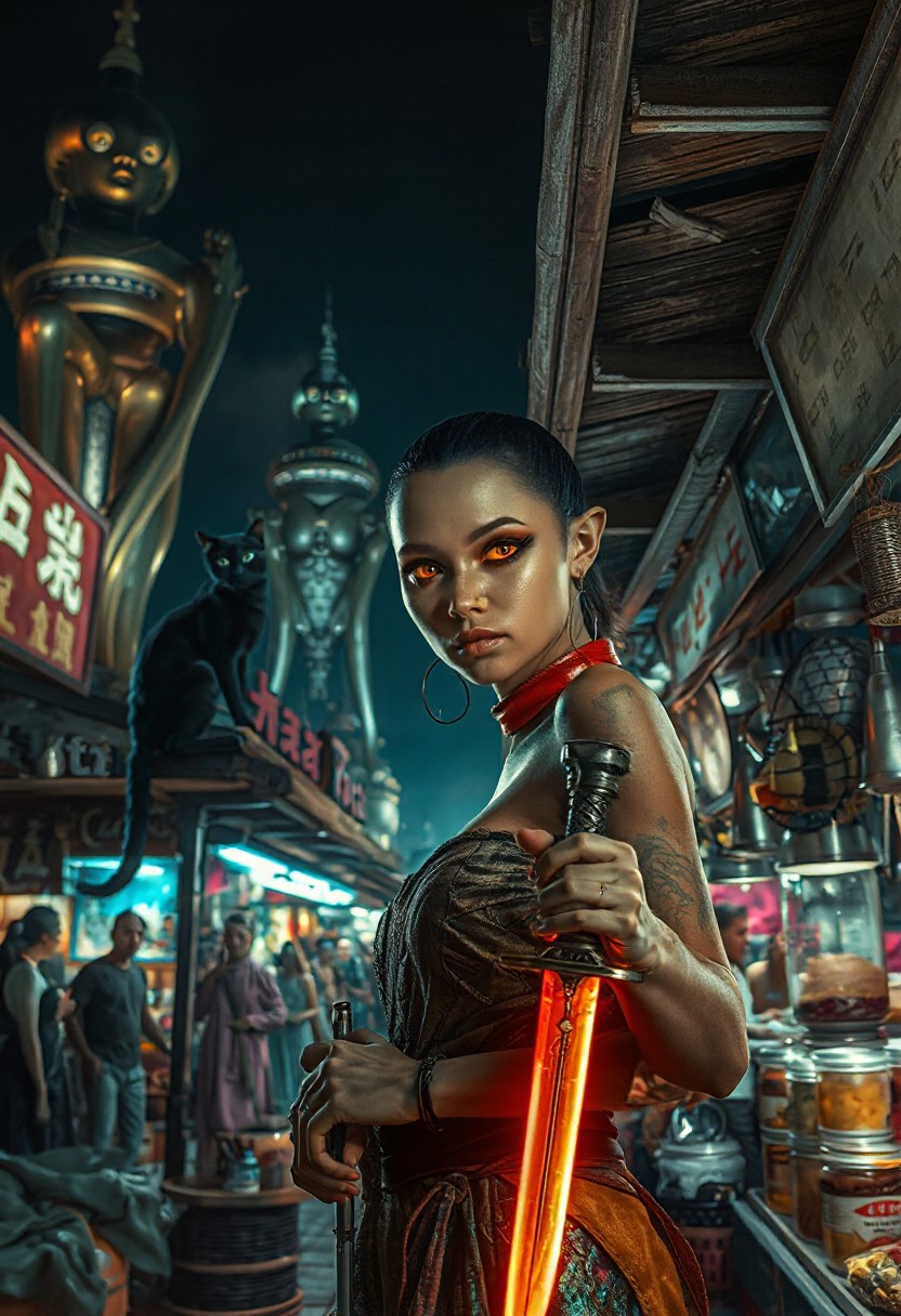 Setting is an extraterrestrial alien street market at night in a city of an extremely advanced extraterrestrial civilization, ((all writing is in an alien script)), ((all lighting is exotic and of an extremely advanced technology., the market is comprised of street vendors selling food, exotic technological wonders, and alien EXOTIC sexy clothing made from colorful iridescent fabrics. (((The many alien beings in view have a variety of appearances some are human-like, others are insectoid or feline or canine or reptilian, they are wearing a variety of clothing are walking through the street market shopping and eating))), A black cat with red collar sits on a nearby wooden roof at a market kiosk. Behind the a kiosk counter are containers of exotic goods, (((a beautiful woman with exotic features, 24 years old, is standing in the foreground facing the viewer with a glowing metal dagger in her hand. Her eyes are detailed and have the luminescence of fiery beautiful jewels focused on the viewer, she has an expression of interested curiosity))), the being is dressed in exotic style clothing of a completely exotic aesthetic. Enormous metallic statues and temples are visible in the background and around the scene and smaller statues are prevalent in the market, Epic image that elicits a feeling of wonder and awe, (((many types of aliens are walking around the market))),