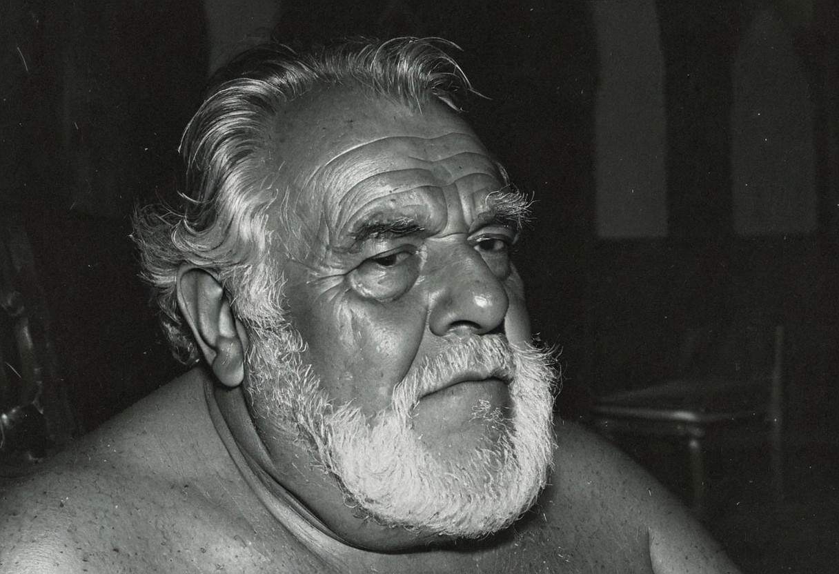 grainy nighttime lowlight photograph, dark room, masterpiece, 4k, solo, alone, tall old hairy tanned grandpa with hairy chest, bullish chubby face with doublechin, face portrait, bushy eyebrows, father, vater, uncle, onkel, stepdad, stiefvater, grandpa, opa, gentle charming expression, romantic, intimate, sitting in a chair in a dark cloister chapel,