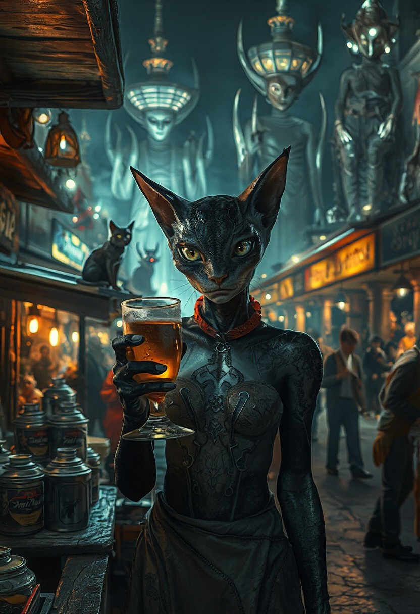 Setting is an extraterrestrial alien street market at night in a city of an extremely advanced extraterrestrial civilization, ((all writing is in an alien script)), ((all lighting is exotic and of an extremely advanced technology., the market is comprised of street vendors selling food, exotic technological wonders, and alien clothing. The extraterrestrial beings have a variety of appearances (some are human-like, others are insectoid or feline or canine or reptilian, they are wearing a variety of clothing are walking through the street market shopping and eating, A black cat with red collar sits on a nearby wooden roof at a market kiosk. Behind the a kiosk counter are containers of exotic goods, (((a beautiful alien anthropogenic cat-like being, 24 years old, is standing in the foreground facing the viewer with a glowing metal goblet of beer in her paw/hand. Her eyes are beautiful and focused on the viewer, she has an expression of interested curiosity))), the being is dressed in exotic style clothing of a completely exotic aesthetic. Enormous metallic statues and temples are visible in the background and around the scene and smaller statues are prevalent in the market, Epic image that elicits a feeling of wonder and awe, (((many types of aliens are walking around the market)))