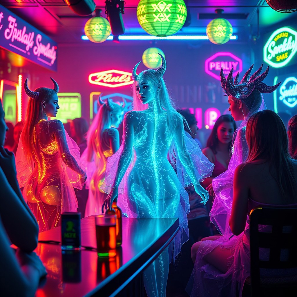 2025-04-10 23:25:32 Prompt A vivid, cinematic strip club scene, illuminated by the pulsating neon lights that cast an ethereal glow on the bioluminescent patrons. In the center of this vibrant tableau, a stunning 32k masterpiece unfolds in a series of manga panels, each depicting a unique transformation sequence of five female Archaea and 1 Bioluminescence translucent male Kaiju. The females, with their translucent bodies revealing intricate bioluminescent veins, wear shimmering glass-like robes that seem to shatter and reassemble as they dance, each movement creating mesmerizing patterns of light. Sitting at the bar talking, Negative Prompt White skin, white people skin ton, Model Aitubo Waifu v2 Style None LoRA SDXL Dragon Style Image Dimension 832 x 1216 Seed 1491587265087659 Prompt Enhance Off Performance Balance