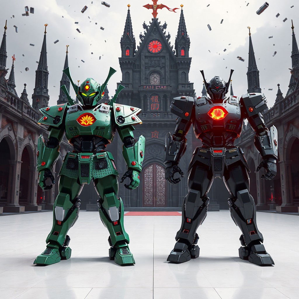 "Ultra-detailed 3D render of two robots standing in unison on a pristine white stage before the Supreme King's Castle, a gothic fortress with obsidian spires and glowing crimson runes. Left: Superheavy Samurai Prodigy Wakaushi – A jade-green mechanoid with kabuto-style helmet, articulated samurai armor plates, and a glowing yellow starburst emblem on its chest. Its head features a pulsating ruby-red sensor array, while twin katanas crackle with plasma energy on its back. Right: Martial Metal Marcher – A matte-black war machine with industrial riveted plating, hydraulic piston limbs, and a blazing amber optic visor. Its chest pulses with a crimson reactor core, and its fists morph into rotating tungsten drill bits. Both robots stand in mirrored battle stances, energy fields intertwining as they face a holographic threat. The castle looms with floating debris and prismatic energy storms, its arches crumbling under cosmic pressure. Dramatic Dutch angle shot using Unreal Engine 5 ray tracing, Octane Render hyper-textures, and Raphael-style chiaroscuro lighting. Metallic surfaces reflect fractal nebulas, while splash ink effects blend with Houdini particle simulations for a retro-mecha aesthetic. 8K resolution, ArtStation-trending composition, golden ratio symmetry, dominated by emerald, onyx, and crimson with chromatic combat-readiness accents."