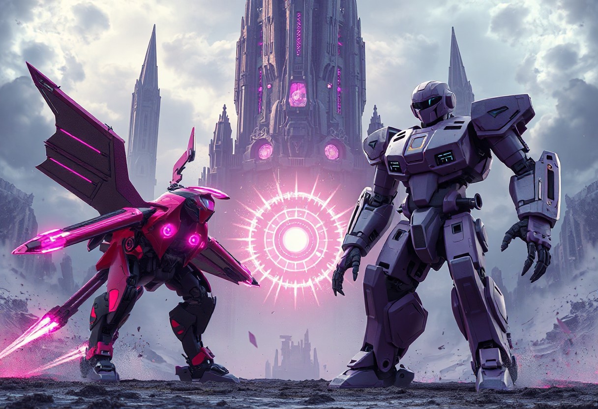"Epic 3D render of two harmonized mechs poised for battle before the colossal Fandora, the Flying Fortress—a floating citadel of jagged obsidian spires, crackling violet energy cores, and levitating debris fields. Left: Flying Pegasus Railroad Stampede – A sleek jet-form mechanoid in electrified magenta and royal purple, its wings swept back with ion thrusters blazing neon-pink plasma trails. Carbon-fiber hull adorned with holographic racing stripes and retractable missile pods. Right: Super Defense Robot Lio – A towering humanoid guardian with matte-lavender armor, hydraulic limbs poised in a defensive stance, and a chest-mounted prismatic shield generator. Its visor glows with AI-targeting grids, while retractable tungsten claws extend from its fists. The duo flank a central energy vortex, their mirrored poses creating dynamic symmetry. Fandora looms with storm-wracked skies, its foundations crumbling as gravitational anomalies distort the battlefield. Dramatic Dutch angle shot using Unreal Engine 5 ray tracing, Octane Render hyper-textures, and Raphael-style chiaroscuro lighting. Metallic surfaces reflect aurora-like energy waves, while splash ink effects blend with Houdini particle storms for a retro-futuristic clash. 8K resolution, ArtStation-trending composition, golden ratio framing, dominated by cyber-magenta and void purple with chromatic combat accents."