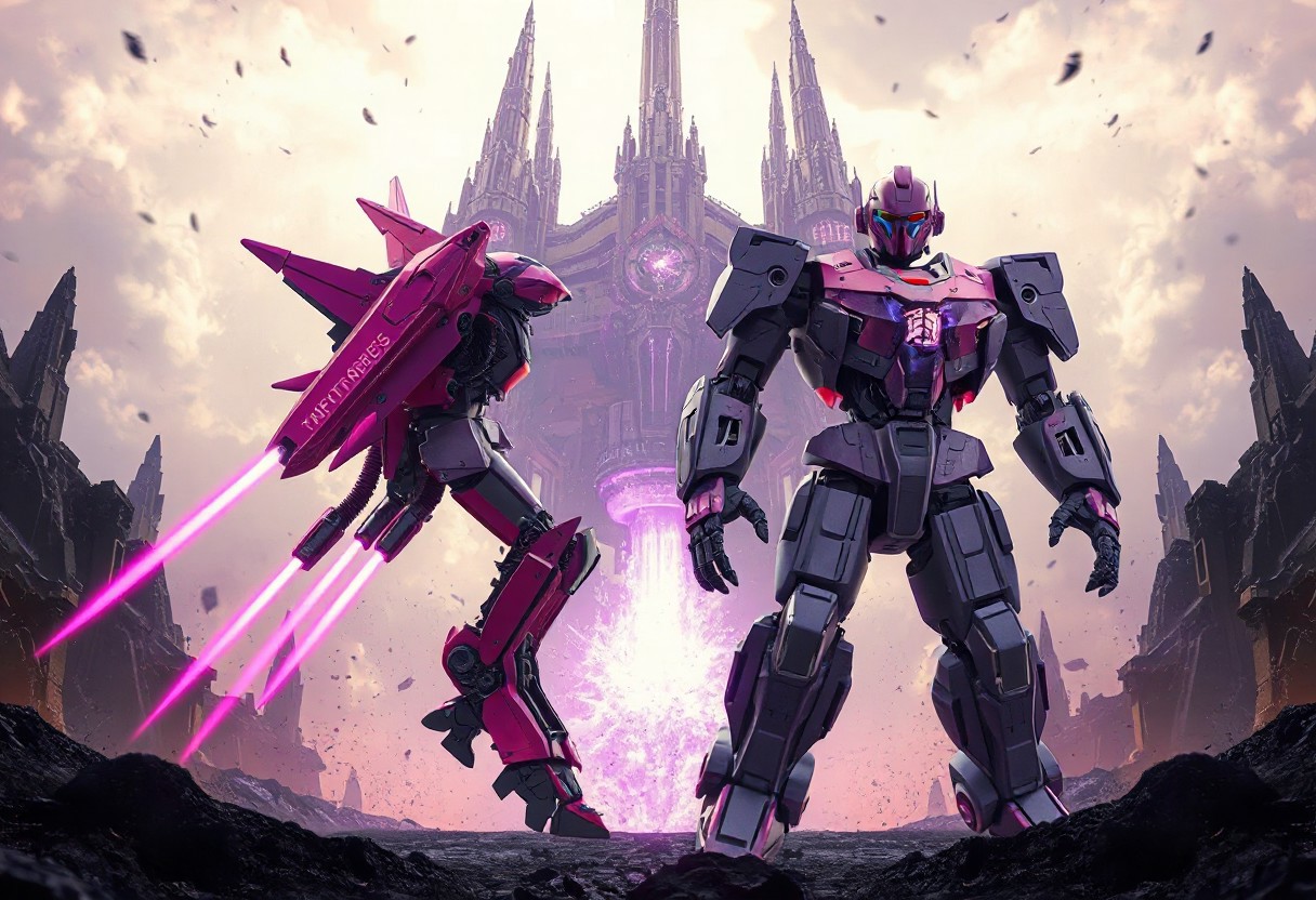 "Epic 3D render of two harmonized mechs poised for battle before the colossal Fandora, the Flying Fortress—a floating citadel of jagged obsidian spires, crackling violet energy cores, and levitating debris fields. Left: Flying Pegasus Railroad Stampede – A sleek jet-form mechanoid in electrified magenta and royal purple, its wings swept back with ion thrusters blazing neon-pink plasma trails. Carbon-fiber hull adorned with holographic racing stripes and retractable missile pods. Right: Super Defense Robot Lio – A towering humanoid guardian with matte-lavender armor, hydraulic limbs poised in a defensive stance, and a chest-mounted prismatic shield generator. Its visor glows with AI-targeting grids, while retractable tungsten claws extend from its fists. The duo flank a central energy vortex, their mirrored poses creating dynamic symmetry. Fandora looms with storm-wracked skies, its foundations crumbling as gravitational anomalies distort the battlefield. Dramatic Dutch angle shot using Unreal Engine 5 ray tracing, Octane Render hyper-textures, and Raphael-style chiaroscuro lighting. Metallic surfaces reflect aurora-like energy waves, while splash ink effects blend with Houdini particle storms for a retro-futuristic clash. 8K resolution, ArtStation-trending composition, golden ratio framing, dominated by cyber-magenta and void purple with chromatic combat accents."