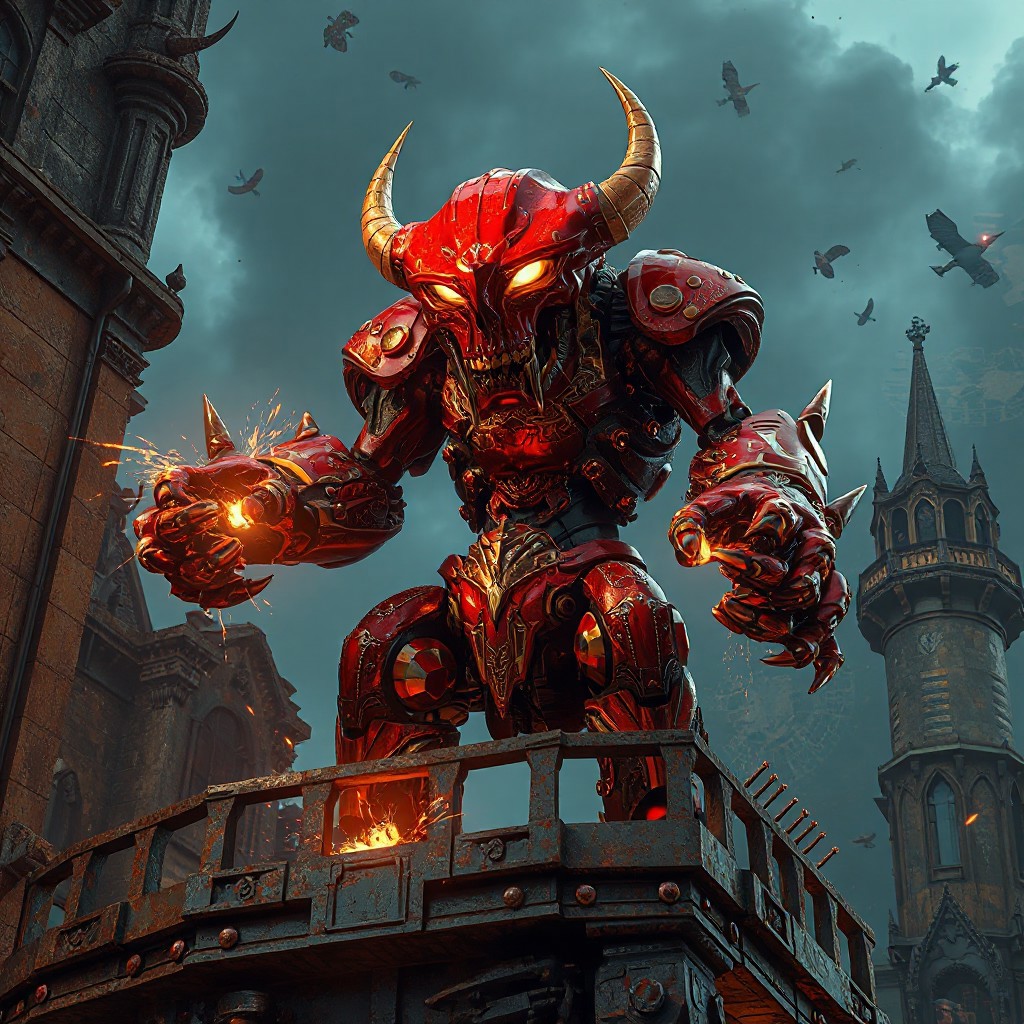 "Ultra-detailed 3D render of a Steel Ogre Grotto, a towering crimson-red mechanoid with gold filigree armor plating, featuring an oversized hammerhead skull glowing with molten circuitry and a compact, heavily-jointed body. Standing in a defensive stance atop a crumbling balcony of the Phantom Fortress Enterblathnir, its piston-driven fists crackle with energy. The fortress looms with gothic spires, floating debris, and holographic siege maps projected across corroded iron walls. Dramatic low-angle shot with Unreal Engine 5 realism, Octane Render textures, and Raphael-style chiaroscuro lighting. Metallic surfaces reflect ember-like sparks, while splash ink weathering effects blend with dieselpunk rivet detailing. 8K resolution, ArtStation-trending composition, golden ratio framing, dominated by vermillion and burnished gold with chromatic aberration flares."