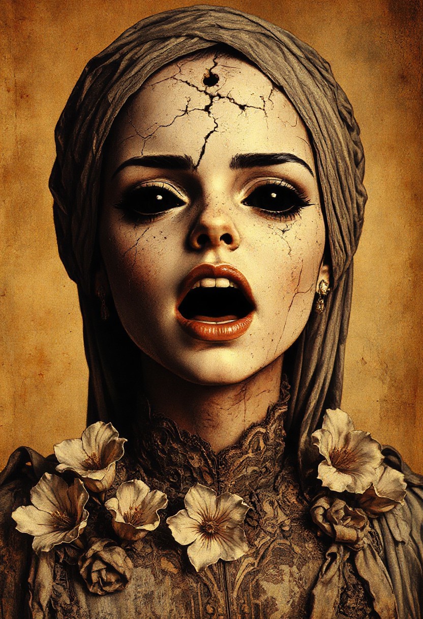 Create an intricately detailed, hyper-realistic portrait of an aging, cracking, and broken Victorian-era porcelain and paper-mache doll depicting a wise woman. A prominent crack with a hole adorns her forehead revealing a subtle glow inside the doll, adding an unsettling and eerie aura to her visage. Her eyes are completely black, resembling deep voids that seem to hold ancient secrets and untold stories. She is set against a backdrop of aged, yellowed parchment, its worn textures complementing her own decaying appearance. Her ornate, Victorian-inspired gown is adorned with delicate, hand-crafted paper flowers, their petals unfolding like tiny, intricate sculptures—some torn and weathered by time. Her mouth is open wide as if screaming. The overall aesthetic blends Luis Royo's dark, mystical realism with Artgerm's meticulous attention to detail and H.P. Lovecraft's eerie, otherworldly sensibilities. Ambient light casts dramatic shadows across her face, accentuating the aging textures of the paper-mache and the luminous yet cracked porcelain-like skin. The delicate, swirling patterns of the gown's aged embroidery are highlighted, emphasizing the craftsmanship of a bygone era. Wisps of faded lace and frayed edges add to the haunting beauty of the scene. The atmosphere exudes haunting elegance and creeping unease, capturing the duality of beauty and decay in a single, mesmerizing image.