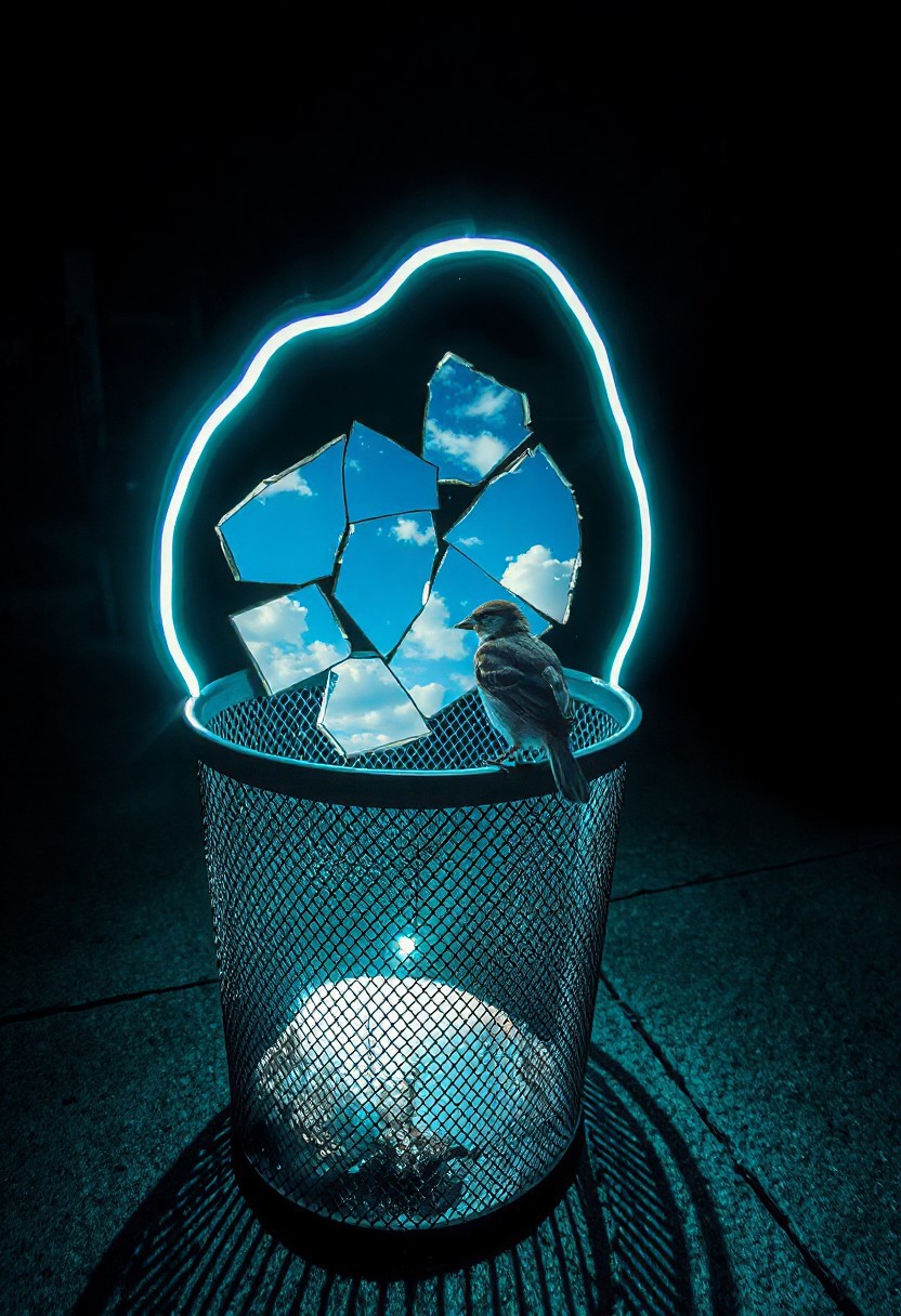 JNANX,luminous white silhouette,cyan glow,emerald highlights,flickering outline,dreamlike movement,rippling colors,drifting embers,infinite black background,psychedelic colors,ethereal,futuristic surrealism,gw,glowing,night,night sky,trippy, Prompt: A street-level, eye-level shot of a dark green, cylindrical metal mesh trash can sitting on a concrete sidewalk. Inside the trash can, several pieces of a broken mirror reflect a bright blue sky with fluffy white clouds. A small brown sparrow with darker streaks sits perched on the rim of the trash can, looking towards the reflected sky within the mirror shards. The sunlight casts a shadow of the trash can and the bird onto the sidewalk.