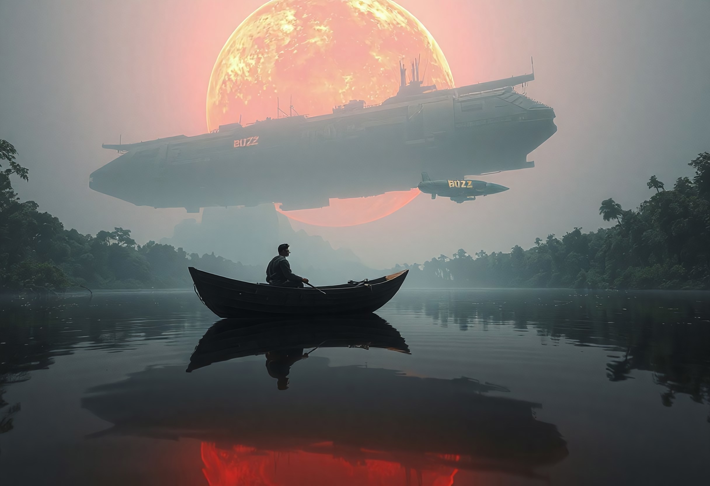 A hyperrealistic cinematic photograph, resembling a shot taken with a state-of-the-art cinema camera, captures a serene moment on a lush, verdant planet within the Warhammer 40K universe. In the foreground, a small, Viking-style boat, constructed from almost black, highly detailed wooden planks, floats gently on a smooth, mirror-like river that perfectly reflects the surrounding environment. Seated in the boat are a man and his son, their silhouettes visible against the backdrop as they gaze skyward. The scene is illuminated solely by the crimson glow of a massive red giant gas planet overhead. Dominating the sky is a colossal Lunar Wolves battleship, its immense silhouette partially obscuring the gas giant, extending beyond the frame of the image. Closer to the ground, a second ship flies low, emblazoned with a giant, glowing "BUZZ" on its hull. The composition emphasizes the contrast between the tranquil, natural setting and the imposing, futuristic spacecraft, creating a poignant juxtaposition. The image is rendered in ultra-high detail, capturing the intricate textures of the boat's wood, the stillness of the water, and the atmospheric lighting, evoking a sense of awe and wonder. Eye-level shot, approximately 20 cm above the waterline, emulating the perspective of a handheld cinema camera.