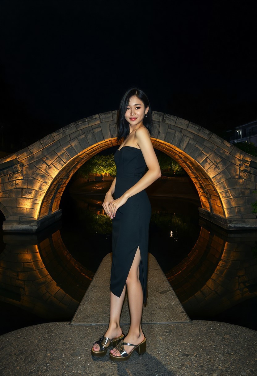 DSLR-style, slender, elegant 26-year-old Korean model, translucent pale skin with natural texture, soft shadow on cheek, diffused daylight from side, parted lips, masterpiece, ultra high-res <lora:NOOB_vp1_detailer_by_volnovik_v1:1> barely visible pores, subtle skin texture variation, translucent skin tone, full body. "A full shot of a slender person with dongtan dress, dark hair, smiling and looking directly at the viewer. They are wearing a black, dongtan dress. The person is also wearing metallic silver platform sandals with clear straps. They are standing a stone arched bridge at night, illuminated by warm lights that highlight its architectural details. The bridge spans a calm body of water, where its semi-circular form is reflected perfectly, creating the illusion of a full circle or moon shape. The surrounding environment is dark, with hints of greenery and other architectural elements visible in the background, suggesting an urban or park setting at night."