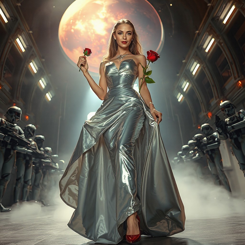 slender arrogant cold femme fatal russian princess wearing rich full skirt glossy silver foil gown, small size opulent glossy red high heels, jewels, holding red rose in her right hanfd, lifting her skirts with left hand, posing standing, view from below, evil grin, green eyes, lipstick, giant portal to outer space, fog from the floor, empire spaceship hangar, surrounded by halo odst troopers, TIE spaceships at the background, fashion look, hollywood, vogue makeup, porcelain skin, long haired, ultrathin waisym reminiscent of Lucas, Spielberg styles, with close-up glamour photography and dramatic lighting view from below,