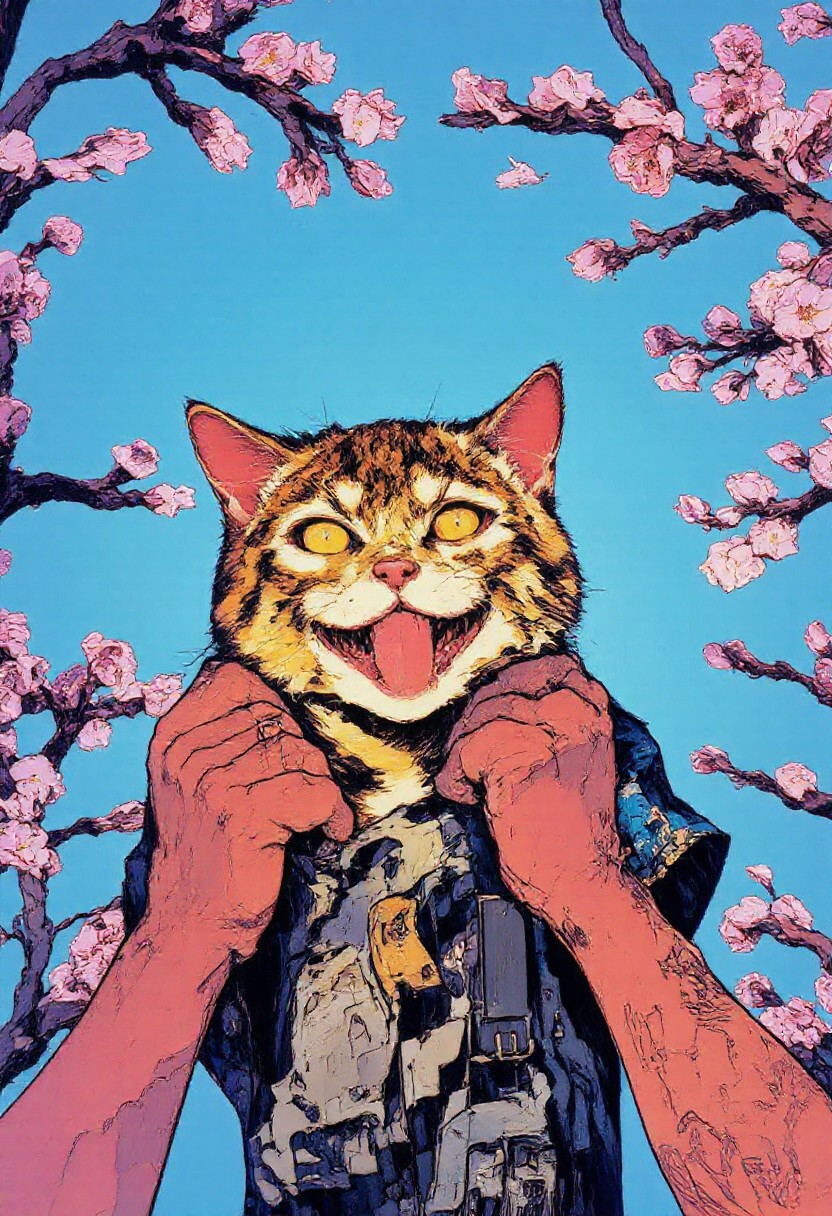 <lora:CPA:0.5> <lora:FLUX-daubrez-DB4RZ-v2:0.3> <lora:ck-shadow-circuit:0.35> in the style of cksc, <lora:수묵화_No2:0.3> "A tabby cat with visible sharp teeth and a pink tongue is held up by two hands wearing a blue and white striped shirt. The cat's eyes are squinted, and it appears to be meowing or hissing. The background is a bright blue sky with blossoming pink and white flowers on tree branches."