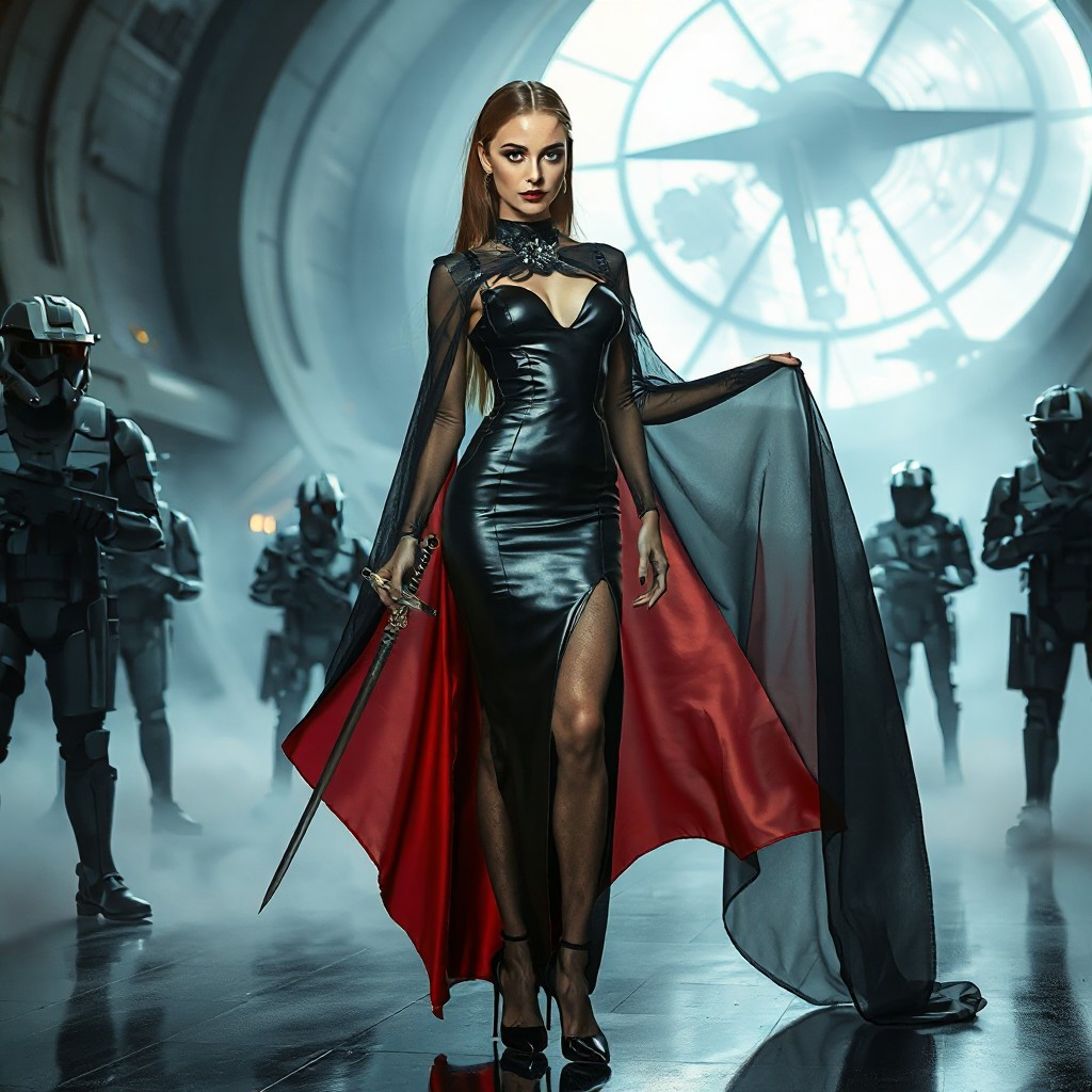 slender arrogant cold femme fatal russian princess wearing fitted black glossy leather high slit gown with red lining, (lace top stockings with suspenders), small size opulent glossy high heels, ultrathin black transparent slime cloak, jewels, holding elegant small sword in right hand, posing standing, evil grin, green eyes, lipstick, giant portal to outer space, fog from the floor, empire spaceship hangar, surrounded by halo odst troopers, TIE spaceships at the background, fashion look, hollywood, vogue makeup, porcelain skin, long haired, ultrathin waisym reminiscent of Lucas, Spielberg styles, with close-up glamour photography and dramatic lighting