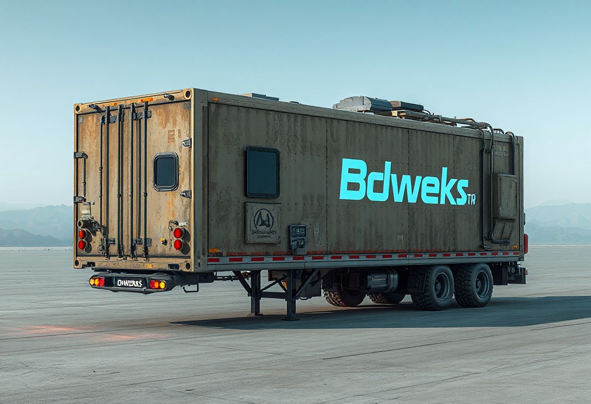 1 vehicle, cyberpunk oversize industrial trailer. Logo label "BDwerks®" written on the side nothing else written.