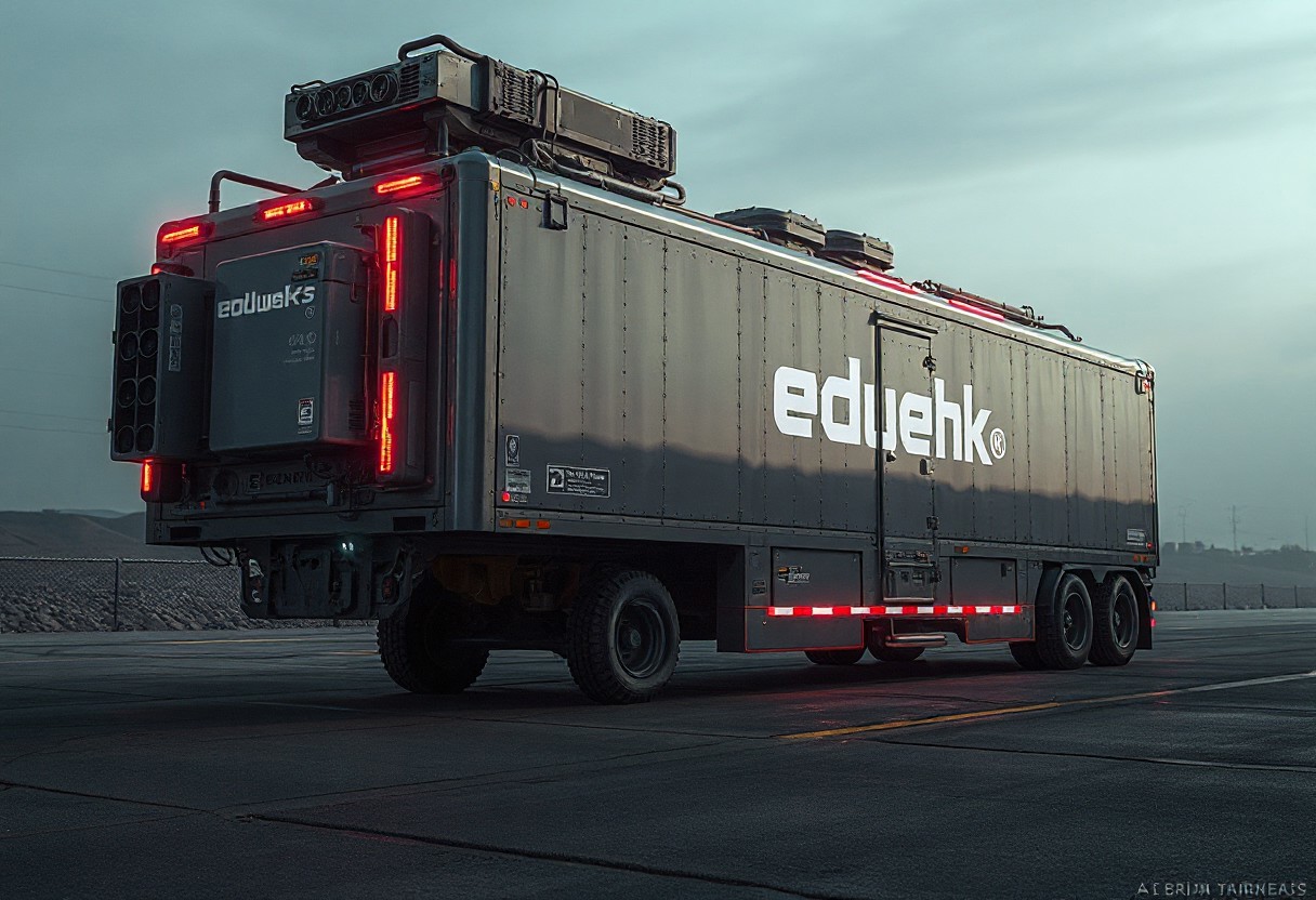 1 vehicle, cyberpunk oversize industrial trailer. Logo label "BDwerks®" written on the side nothing else written.