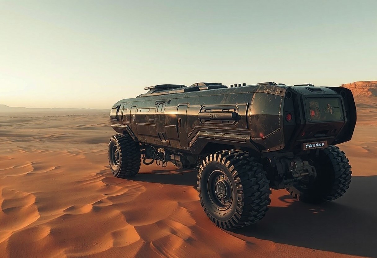 1 vehicle, cyberpunk long motorcoach. large wheels. Large cabin in a desert background. View from above.