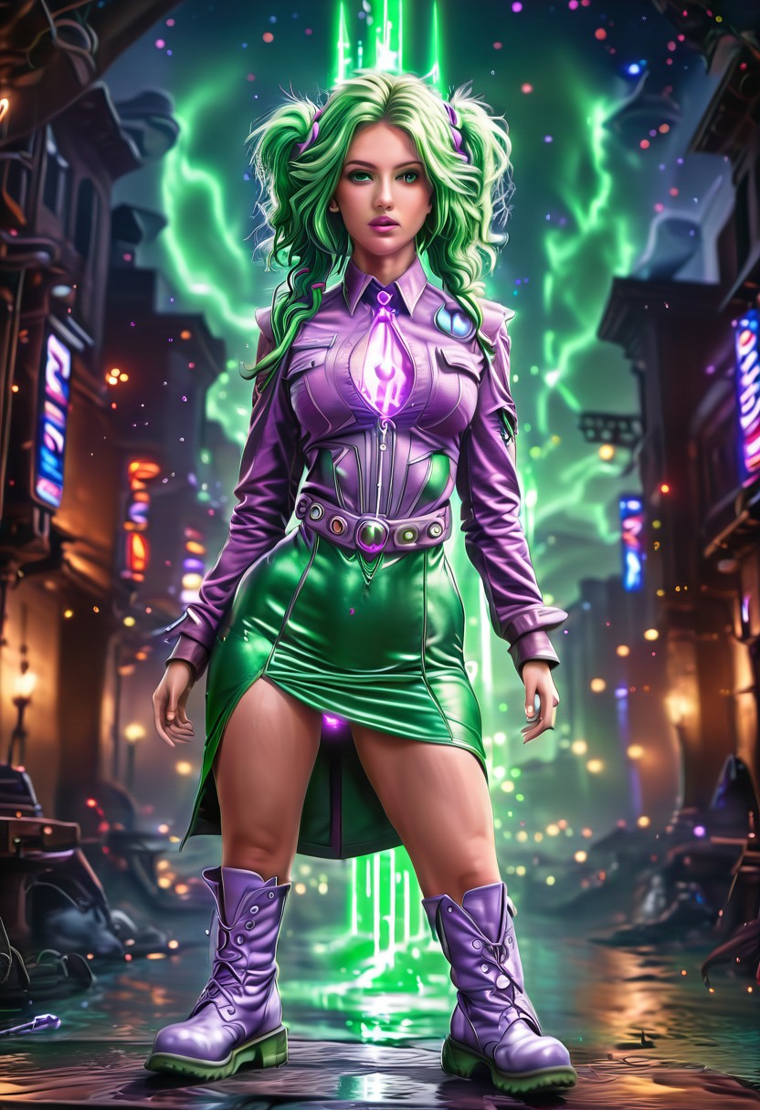 Mystic Lumina, solo, scifi, futuristic city, female, green hair, big hair, twin tail, hour glass figure, high detail, perfect face, 28 years old, fully dressed, night, censored, jacket, purple shirt, long skirt, white boots.