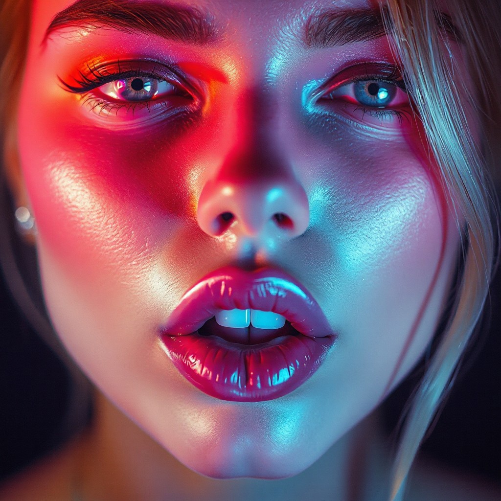 a 4k highly detailed image a stunningly gorgeous ((PARTIALLY BITE THE LIPS))super model with eyes that reflect a surreal space image, a color gradient light baths her,