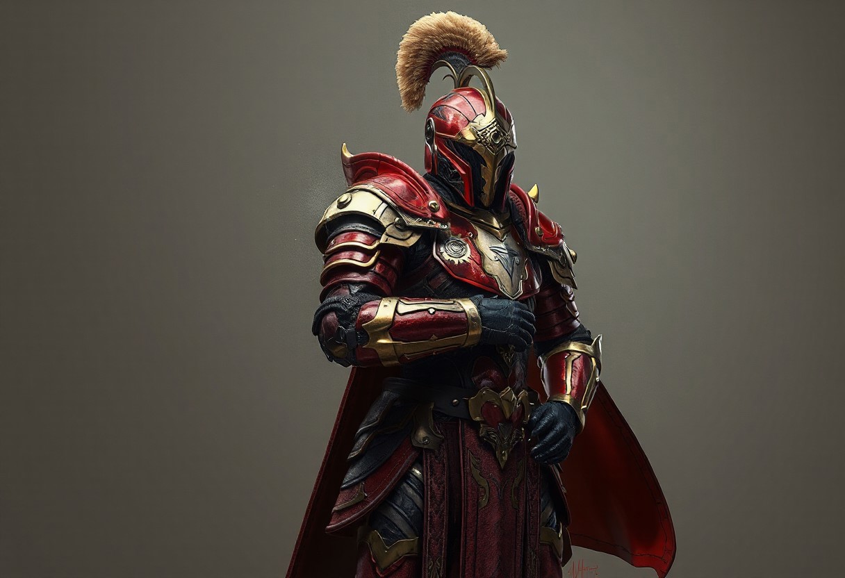 Digital rendering showcases a Gravekeeper's Cannonholder, ready for battle, dressed in an intricately detailed Metal Armored Bug suit, predominantly red and gold with black and silver accents. The helmet features a prominent plume, and the Cannonholder's confident posture, with one hand on the hip and the other on the thigh, exudes a sense of readiness. A neutral backdrop of an Aquamirror Contact enhances the vibrant colors of the armor in the 4K image, which boasts exceptional quality, lifelike details, sharp lines, harmonious colors, and a dynamic action pose, all handcrafted with precision and high-quality brush strokes. The image's impeccable composition, captivating lighting, and vivid emotions make it a stunning and beautiful artwork, with detailed eyes and a powerful message, trending on ArtstationHQ.