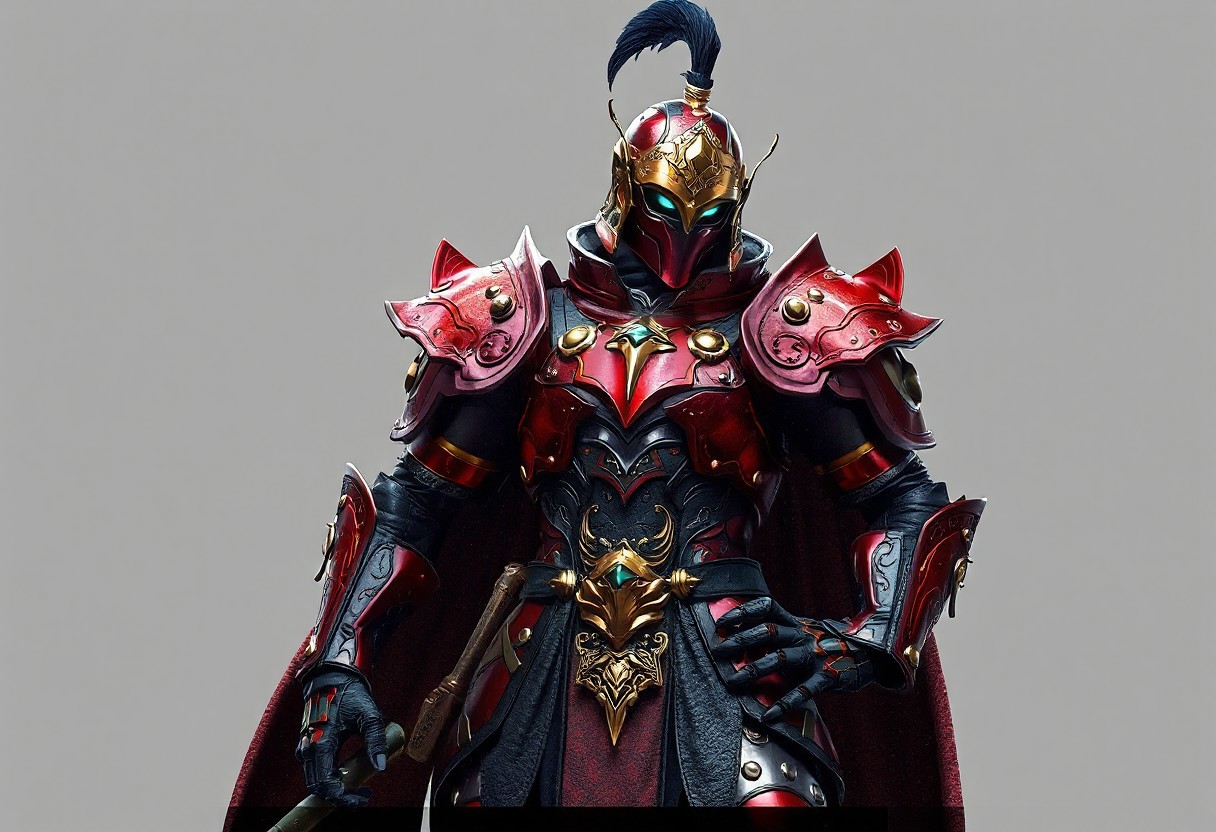 Digital rendering showcases a Gravekeeper's Cannonholder, ready for battle, dressed in an intricately detailed Metal Armored Bug suit, predominantly red and gold with black and silver accents. The helmet features a prominent plume, and the Cannonholder's confident posture, with one hand on the hip and the other on the thigh, exudes a sense of readiness. A neutral backdrop of an Aquamirror Contact enhances the vibrant colors of the armor in the 4K image, which boasts exceptional quality, lifelike details, sharp lines, harmonious colors, and a dynamic action pose, all handcrafted with precision and high-quality brush strokes. The image's impeccable composition, captivating lighting, and vivid emotions make it a stunning and beautiful artwork, with detailed eyes and a powerful message, trending on ArtstationHQ.