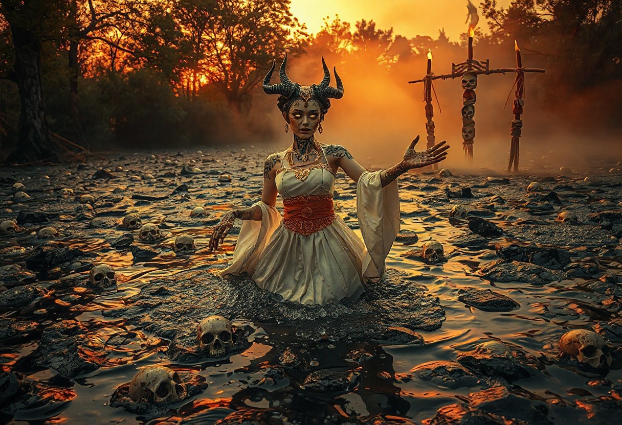 It's evening. Golden hour. Orange glow shoots rays through the trees around the lake of bubbling tar. Thick bubbles rise above the surface and pop. In the center is a robotic geisha demon with glowing eyes halfway submerged in the tar. Small skulls are barely floating around in the thick tar and the demon is dancing seductively to lure you in. The photo is taken from the tar surface looking up, and she holds out a welcoming hand out for you, like a ballet dancer. Her body contorts into weird shapes and her face is without emotion and her eyes scream danger. Her dress is white and gold, lots of jewelry and golden chains, and her head is crowned with horns. She has henna tattoos over her arms with mysterious symbols. She's inviting you to step into the tar pit. You must resist her temptation... In the background, there are totems made from sticks and rope. A torch burns at the top. There's a thick layer of mist, smoke and ash in the air, possibly from a wildfire raging nearby.