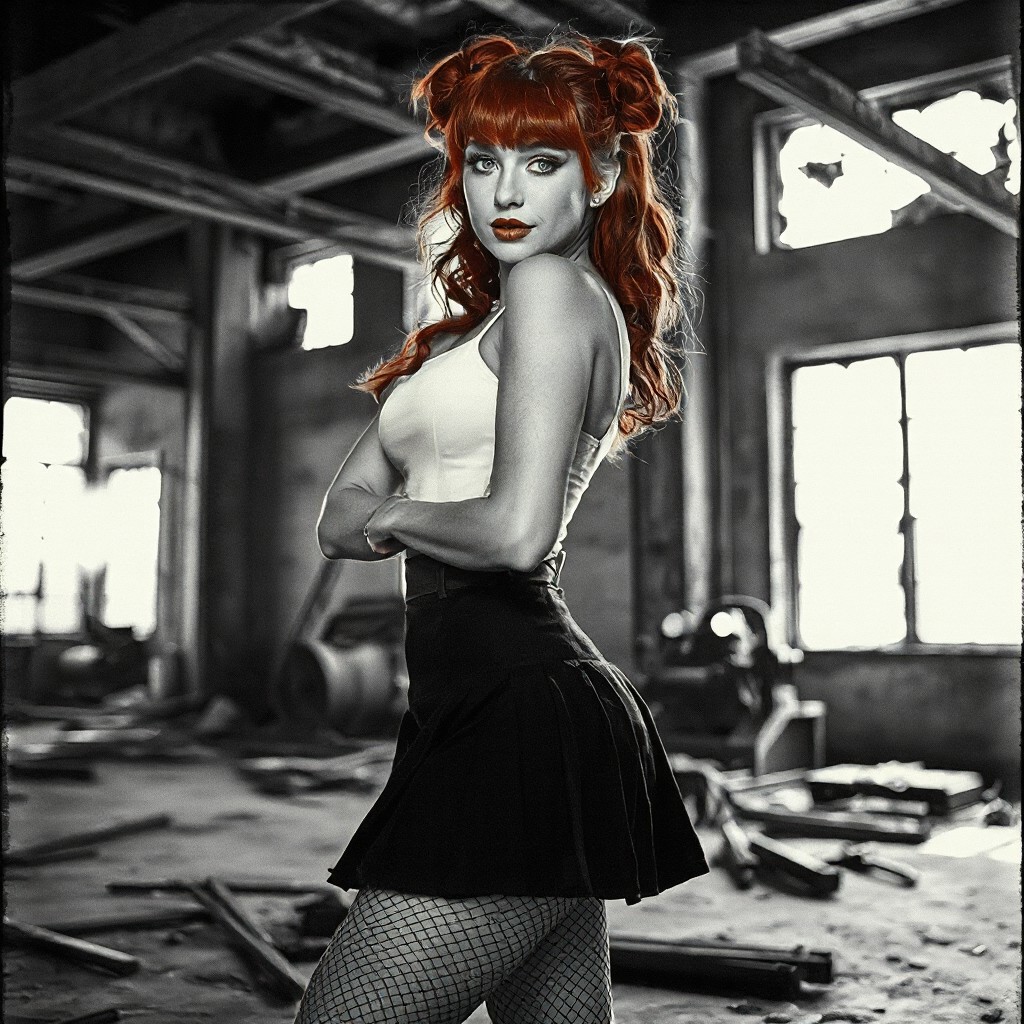 Zilcova1, (Anton Corbin photography style), (gritty, high contrast, slow shutter speed, grainy), (film grain:1.5), (black and white, greyscale, B&W), film border, vignette, 1woman, (thighs up photo, solo:1.15, (masterpiece), 1 woman, solo:1.15, 21 years old:1.1, tall, skinny, (flat chested), skinny hips, skinny legs, dynamic posing:1.35, humans on hip, hips tilted, bangs, ponytail, long hair, red hair, blue eyes, seductive eyes, pink eyeshadow, pink lower eyeshadow, full pouty lips, lips parted, seductive smile, blush, dynamic angle:1.3 tight White tank top:1.5, no bra, covered nipples, standing, bangs:1.2, long wavy hair pulled back into twin buns:1.5, detailed light eyes, she is wearing a tight tank-top, short pleated black skirt, fishnets, She is in an abandoned factory, urban decay, gritty, rusty old machinery, large windows, broken dirty windows, floor littered with old tools, light rays shining through broken windows, rim lighting,