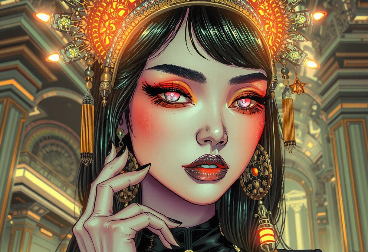 A highly detailed, intricate line-art illustration in the style of syd mead. Detailed hyper realism in the visible body parts (face, hands, legs). 3D rendering, face close-up, CG high model, Elegant [goth ] with bold colored glowing makeup and a holographic asian headdress, in a [chrome and gold] cyberpunk aesthetic, dark fantasy, anime-style, illuminated by soft lighting , acrylic painting in style Adam Hughes. The composition features mesmerizing line work, fine architectural detailing in the background, and a play of light and shadow through intricate hatching. The overall aesthetic is serene, introspective, and dreamlike, blending realism with a highly structured, almost meditative pattern-based design.