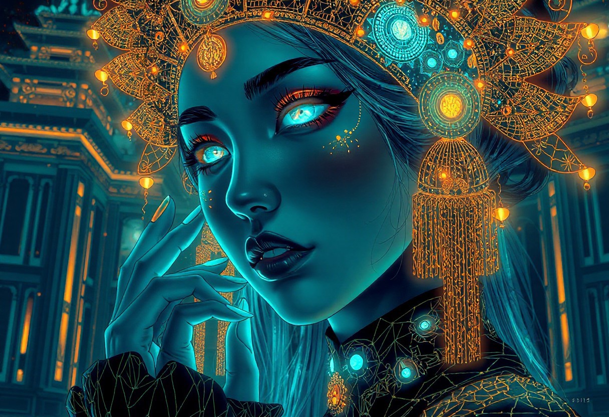 A highly detailed, intricate line-art illustration in the style of olivia berardinis. Detailed hyper realism in the visible body parts (face, hands, legs). 3D rendering, face close-up, CG high model, Elegant [goth ] with bioluminescent glowing makeup and a holographic asian headdress, in a [teal and gold] cyberpunk aesthetic, dark fantasy, anime-style, illuminated by soft lighting , acrylic painting in style Adam Hughes. The composition features mesmerizing line work, fine architectural detailing in the background, and a play of light and shadow through intricate hatching. The overall aesthetic is serene, introspective, and dreamlike, blending realism with a highly structured, almost meditative pattern-based design.