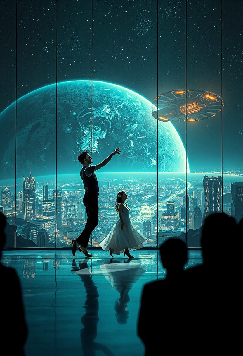 immaculately detailed realistic ultra quality image of a beautiful elegant female dancer and male counterpart are dancing on a futuristic stage micro-LED lighted, the dancer is the focus of the image, every detail of her dress and body are fully visible, the height of the image, behind the dancer on the stage is an enormous seamless and futuristic wall to wall and floor to ceiling window that looks out at a the planet's surface covered with the lights of enormous buildings and cities, An enormous deco starship with futuristic lighting and an enormous space station are visible in the background among the stars, Artistic art deco, dynamic perspective, (((overall architectural aesthetic is Art Deco Cyberpunk))). Epic image that elicits a feeling of romanticism, wonder, and awe, the silhouette of the audience can be seen in the foreground that show the enormous scale of the stage and seamless window behind it,