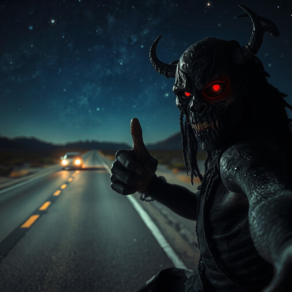 A horror movie scene as a demonic skinwalker hitchhikes on a desert road at night with stars in the scenic night desert sky as a car approaches in the distant background. The skinwalker stares at viewer as he holds his thumb up to hitchhike, his eyes glowing an errie red in the dark night.