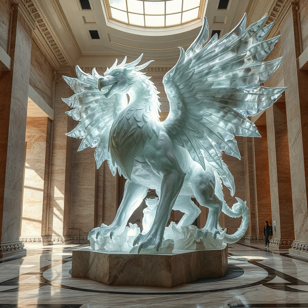 Create an image of a large statue of a mythical creature resembling a griffin, symbolizing the wildness and fury of the elements and nature. The statue is made of translucent stone, which gives it a mysterious and majestic appearance. It is housed in a spacious museum hall, where soft lighting highlights its intricate details and creates a play of light and shadow. In some places, the statue appears translucent, which enhances its airiness. Around the statue, you can see the interior elements of the museum, such as marble floors and high ceilings, which emphasize its grandeur.