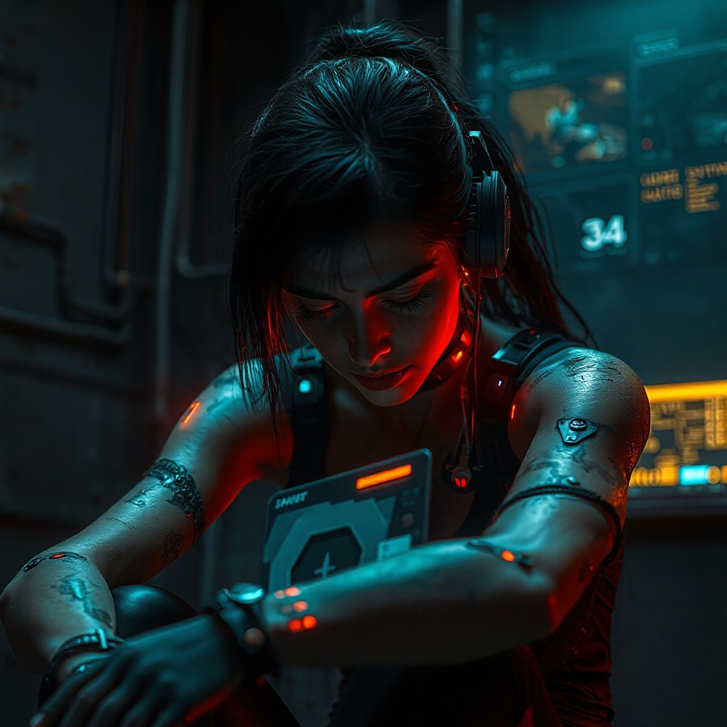 A cyberpunk female operative enhanced with high-tier cyberware, seated in a dimly lit industrial room, head down, arms trembling, visibly drained. Her eyes glow faintly, projecting fragmented holographic UI panels around her — ghost interfaces from the extranet still flickering mid-air. Her body shows signs of long-term integration stress: exposed neural links, burnt-out ports, and glitching implants under her synthetic skin. She’s half-present — lost between the real world and the cyber dimension, digital glitches distorting the air around her. Her environment reflects her burnout: screens full of static, leaking cables, soft neon reflections off cold metal walls. Brutally realistic lighting, cinematic shadow play, photorealistic cyberpunk dystopia, emotional tension, detailed textures, 8K ultra-quality.