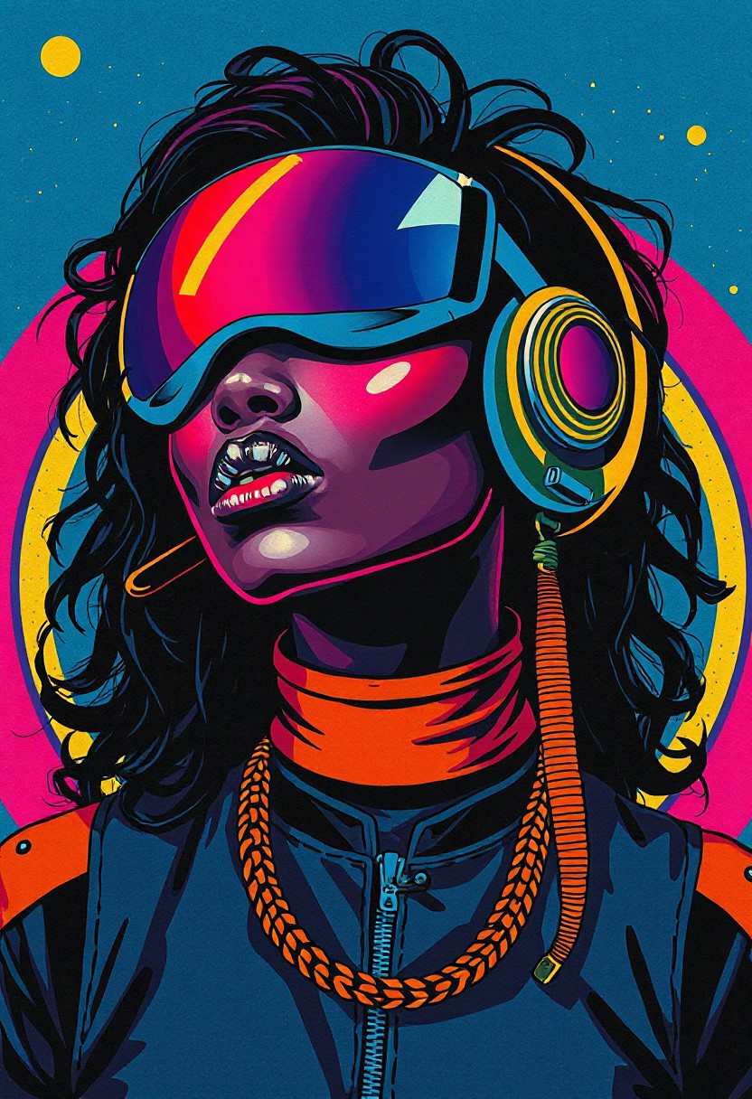 avant-garde black spacewoman , vibrant color palette, bold graphics
