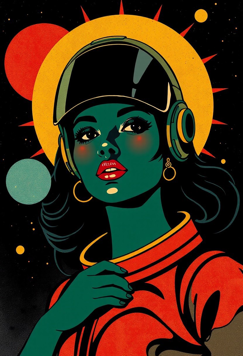 art-deco black spacewoman , vibrant color palette, bold graphics